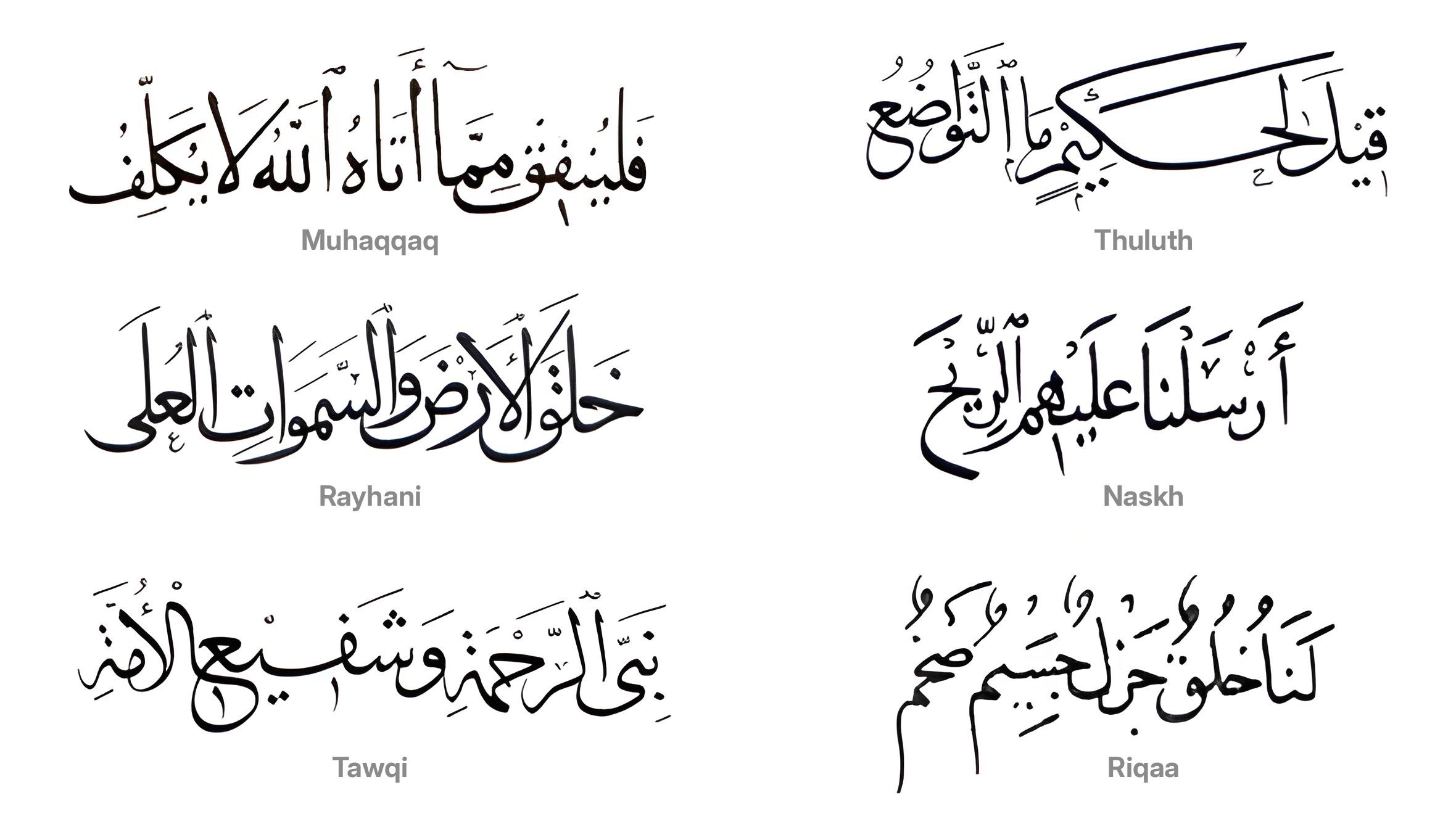 The six Arabic calligraphic cursive styles proposed by Ibn Muqlah: muhaqqaq, thuluth, rayhani, naskh, tawqi and riqaa