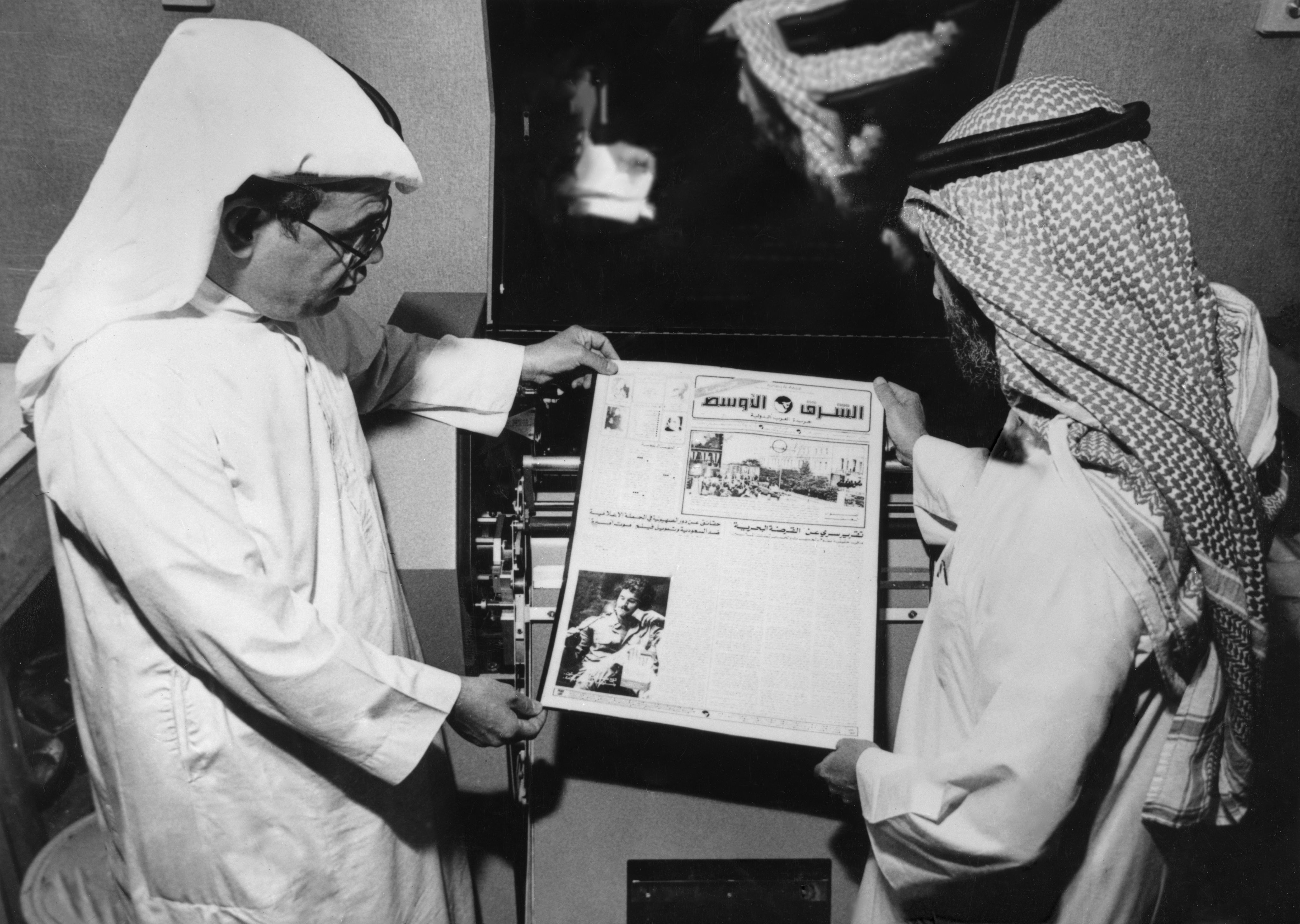 The founders of Asharq Al Awsat newspaper in London inspect a front page in 1980. Getty Images