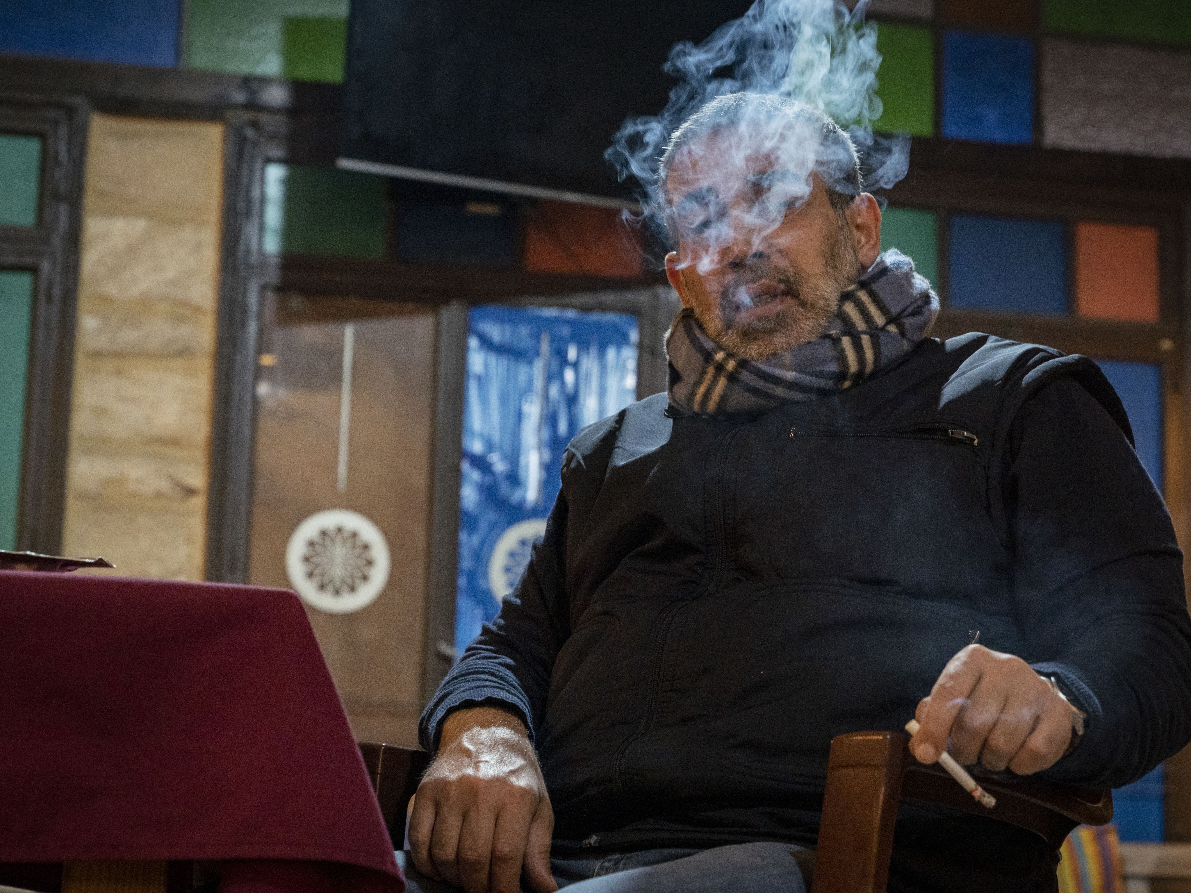 “Honestly, I like to watch and eavesdrop on them,” he says, nodding towards a group of men slapping playing cards down on a table, an argileh pipe hanging from each of their mouths.