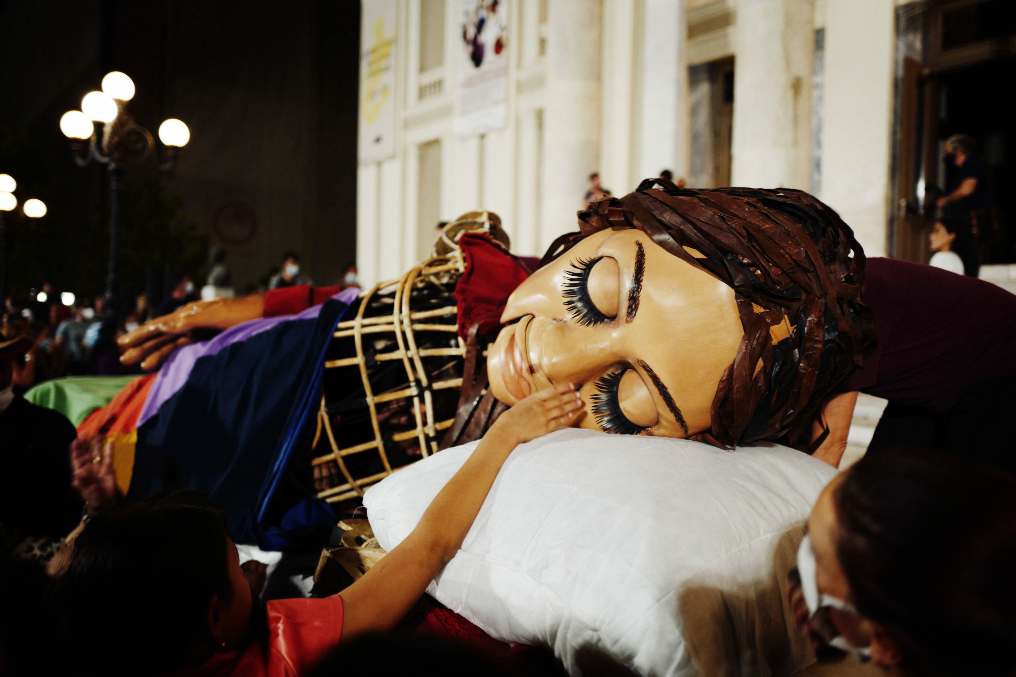 Little Amal ‘sleeps’ outside the Municipal Theatre of Piraeus, near Athens, on September 4, 2021. Photo: Ayman Oghanna / Getty
