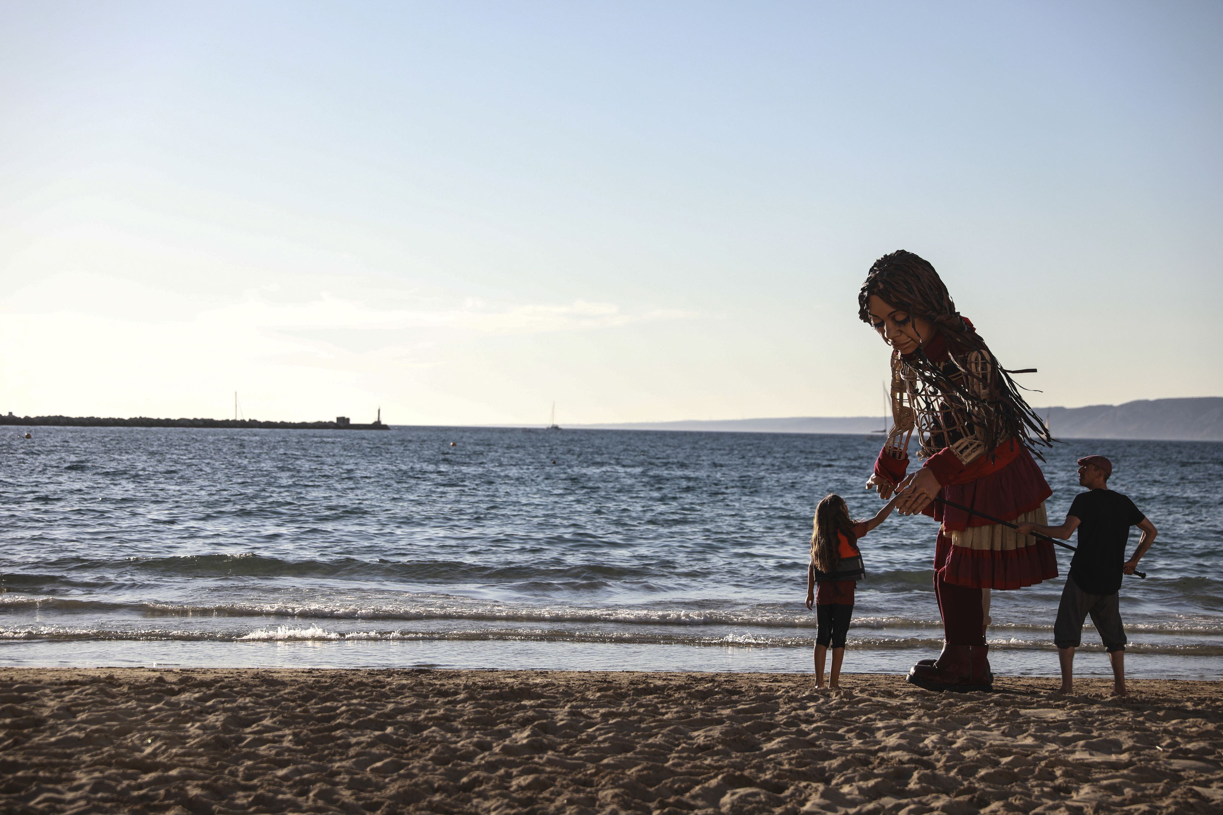 Little Amal on a beach in France. Photo: Abdul Saboor