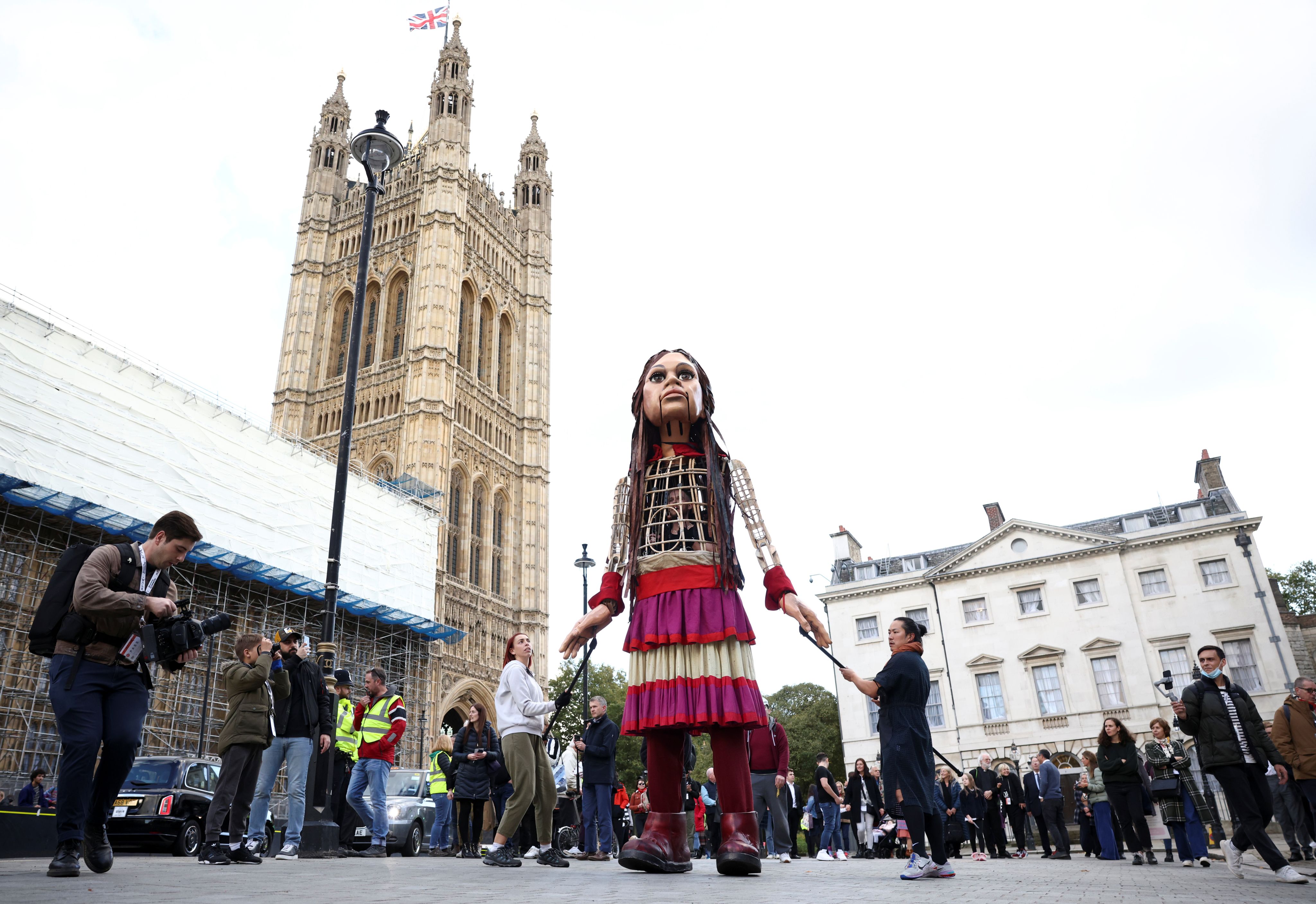 Little Amal seen outside the Houses of Parliament in London on October 25, 2021. Henry Nicholls / Reuters