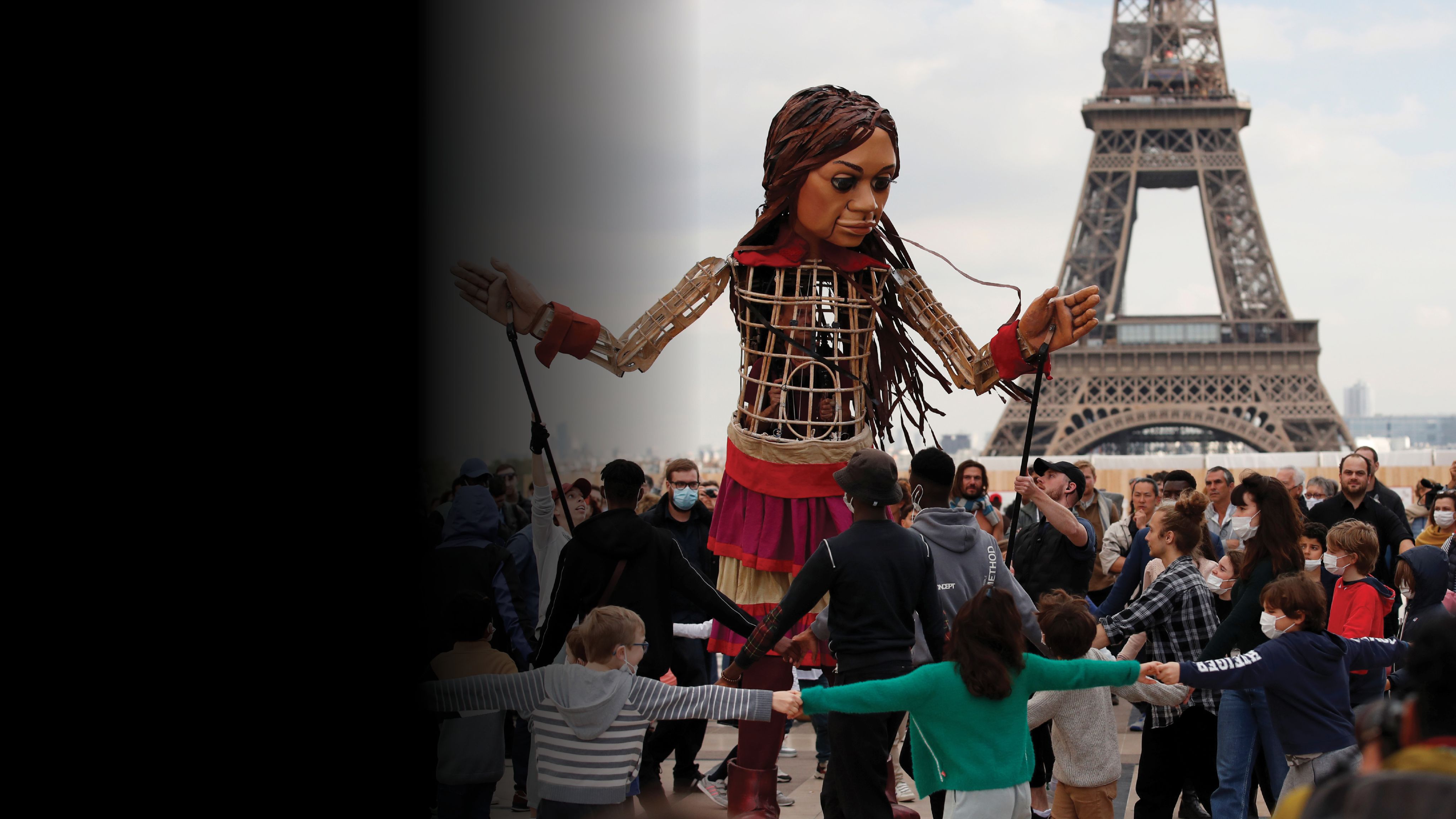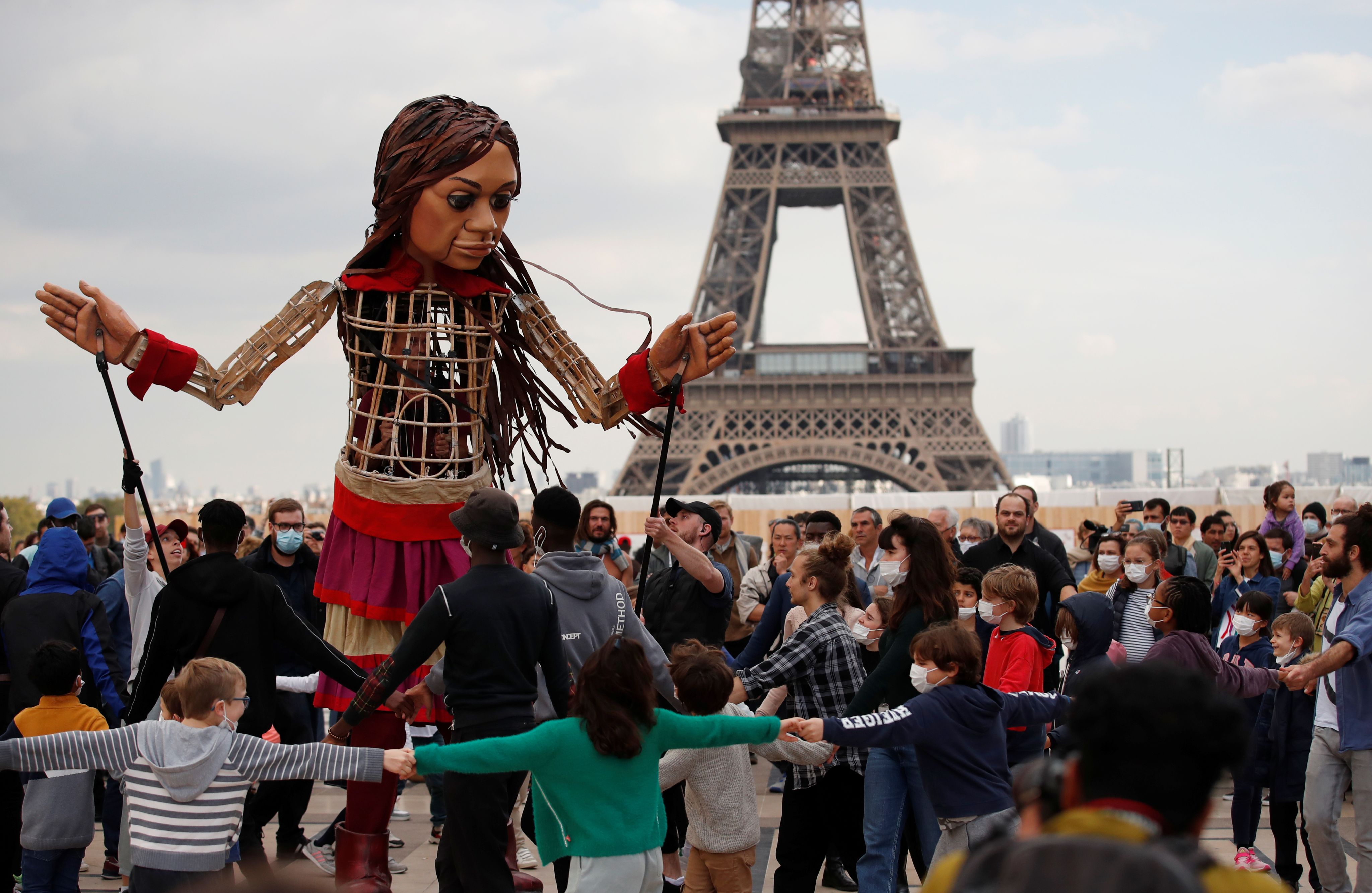People gather around Little Amal during a walk near the Eiffel Tower, on October 15, 2021. Gonzalo Fuentes / Reuters
