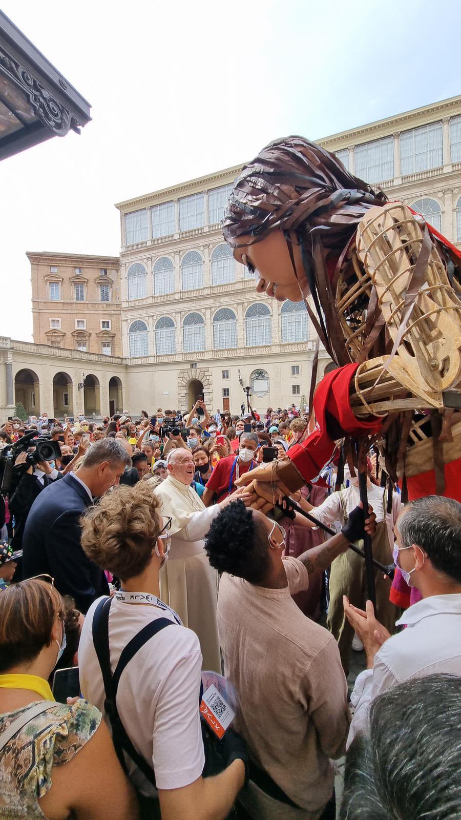 Pope Francis meets Little Amal in the Vatican City. Photo: Sarah Loader