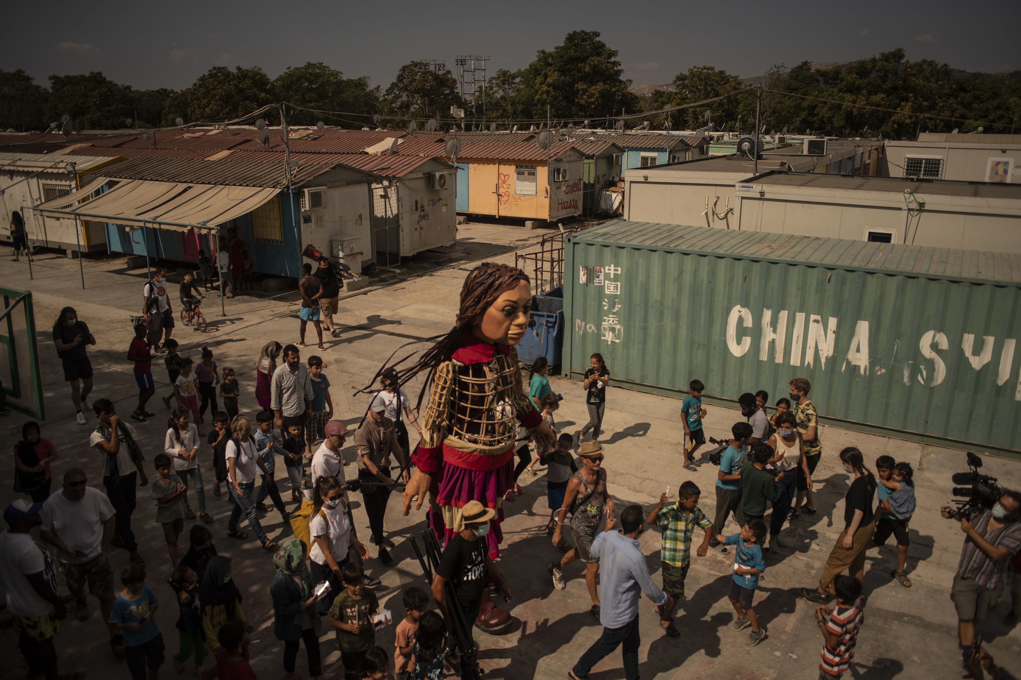 Little Amal walks through a refugee camp made up of shipping containers. Photo: André Liohn
