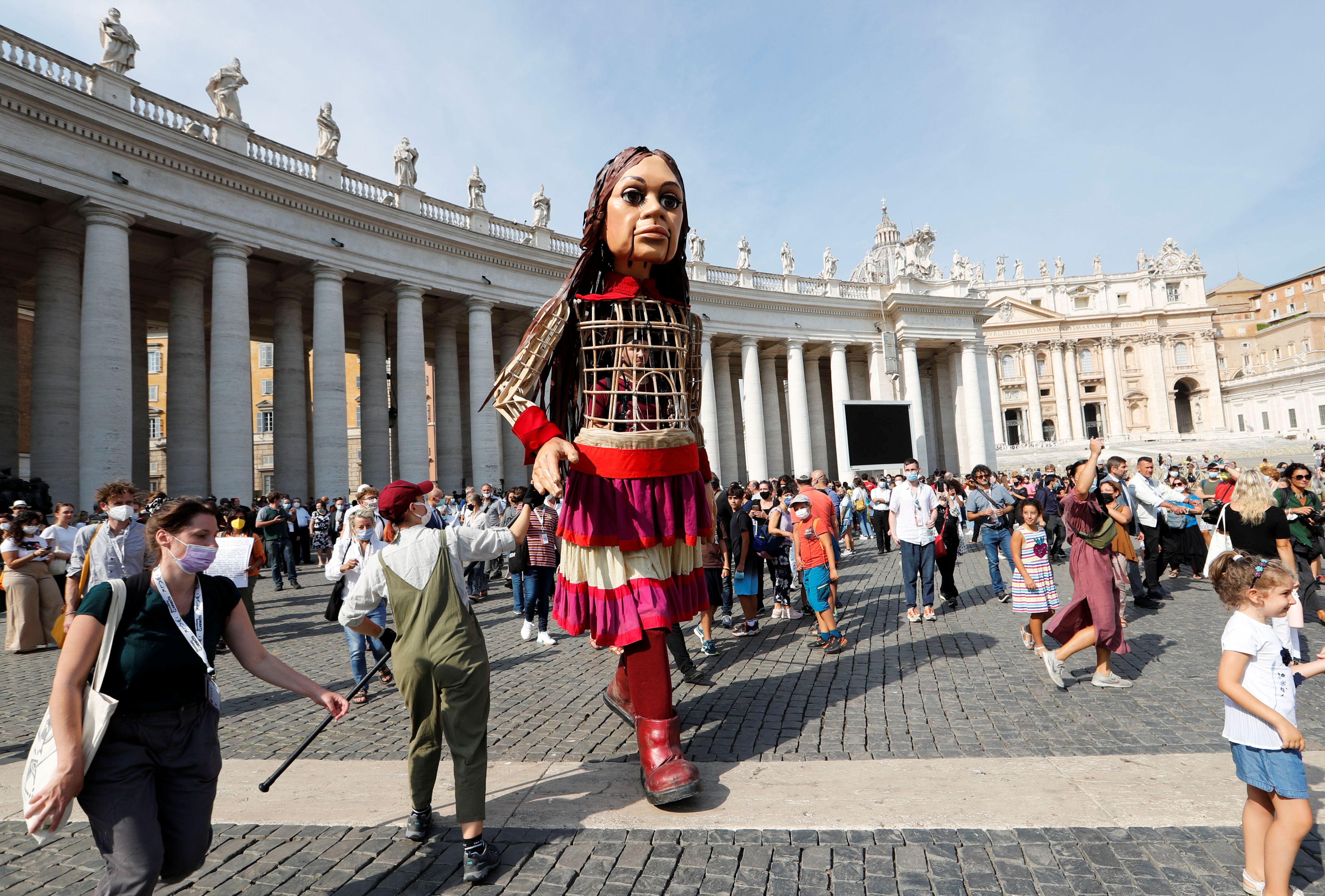 Little Amal is greeted in the Vatican as she travels across Europe from Turkey to Britain, on September 10, 2021. Remo Casilli / Reuters