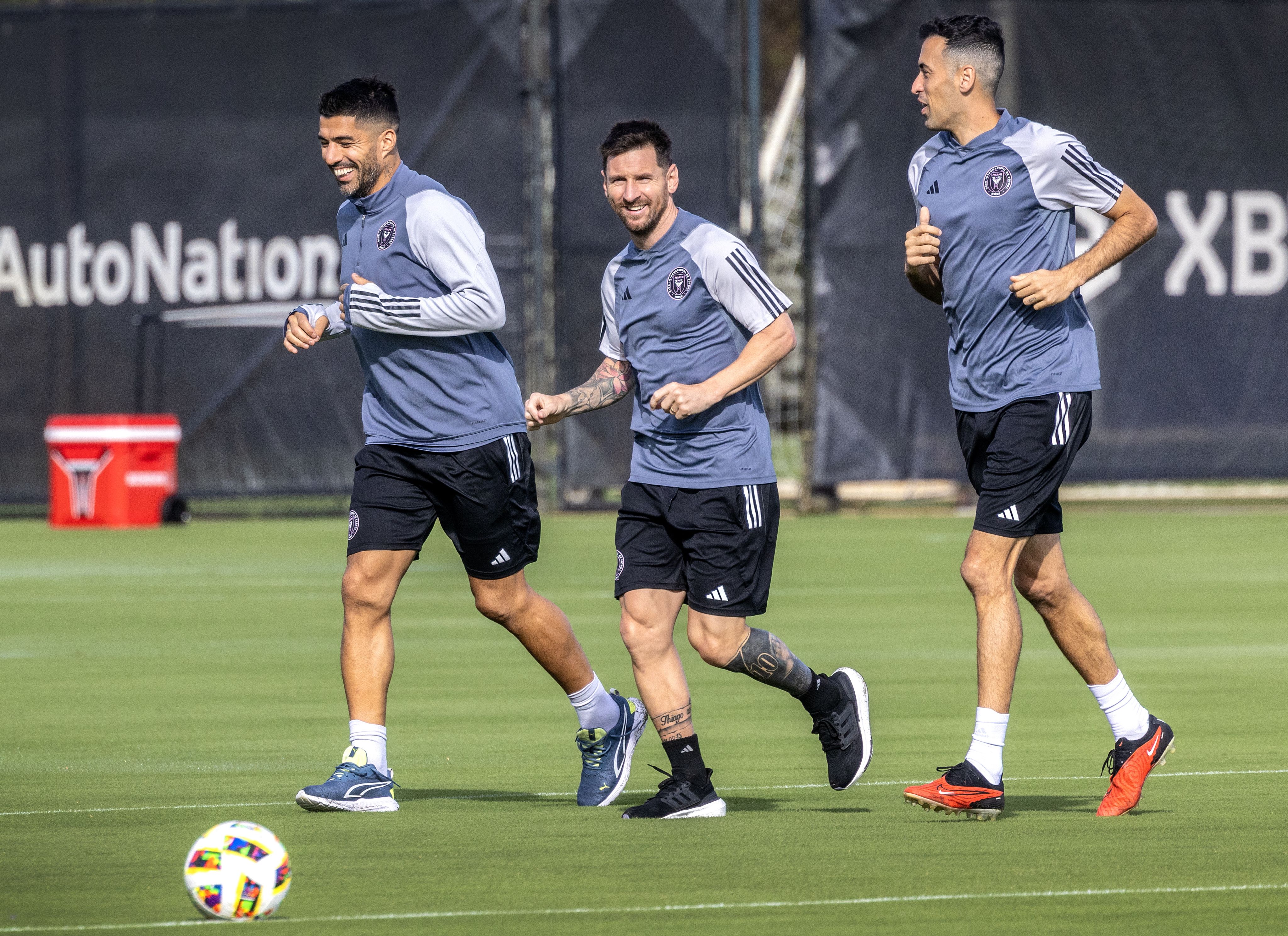 Messi trains with Inter Miami teammates Luis Suarez and Sergio Busquets. EPA
