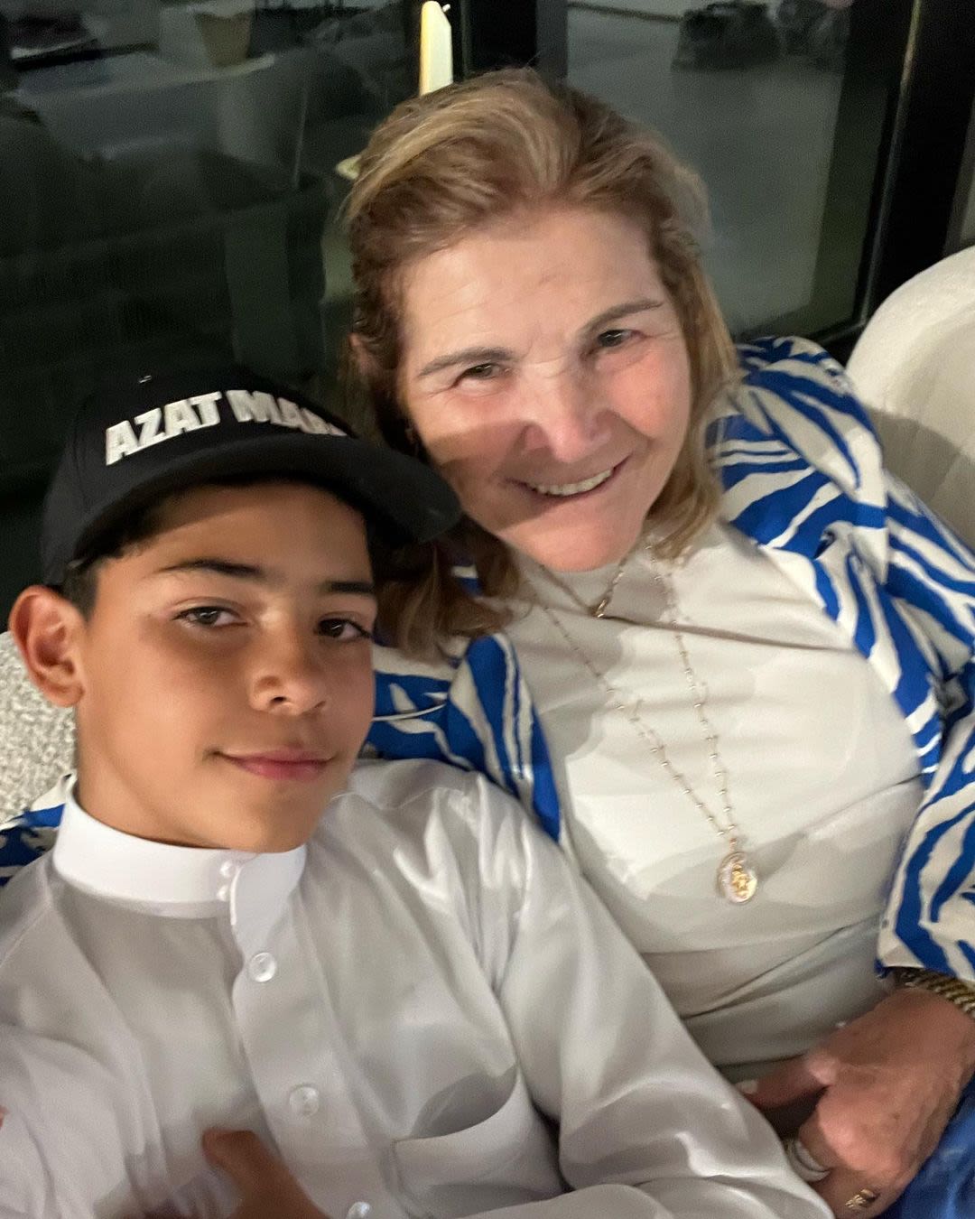Cristiano Jr, sitting with his grandmother, wears a traditional Saudi thobe. Photo: Maria Dolores dos Santos Aveiro / Instagram