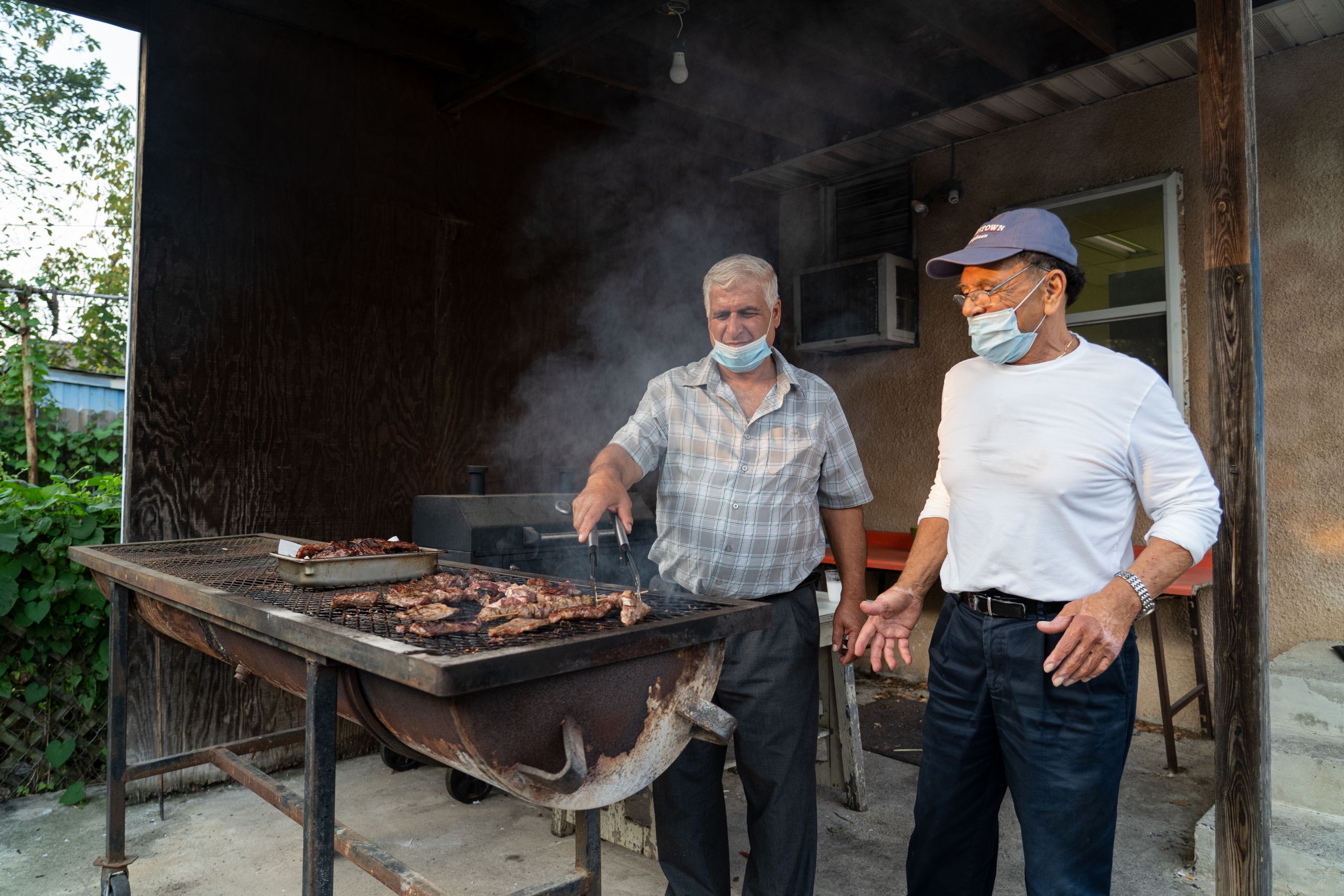The 78-year-old Syrian American, keeps a watchful eye over the skirt steaks and lamb kebabs he’s grilling for fellow members of the Syrian Arab American Charity Association.
