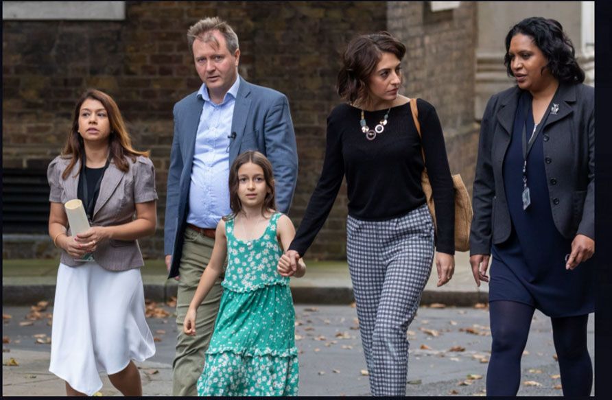 From left, Tulip Siddiq MP, Richard Ratcliffe, daughter Gabriella, Elika Ashoori and Janet Daby MP arrive to 10 Downing Street to deliver a petition signed by Members of Parliament calling on Boris Johnson to work to free Nazanin Zaghari-Ratcliffe, on September 23, 2021. EPA