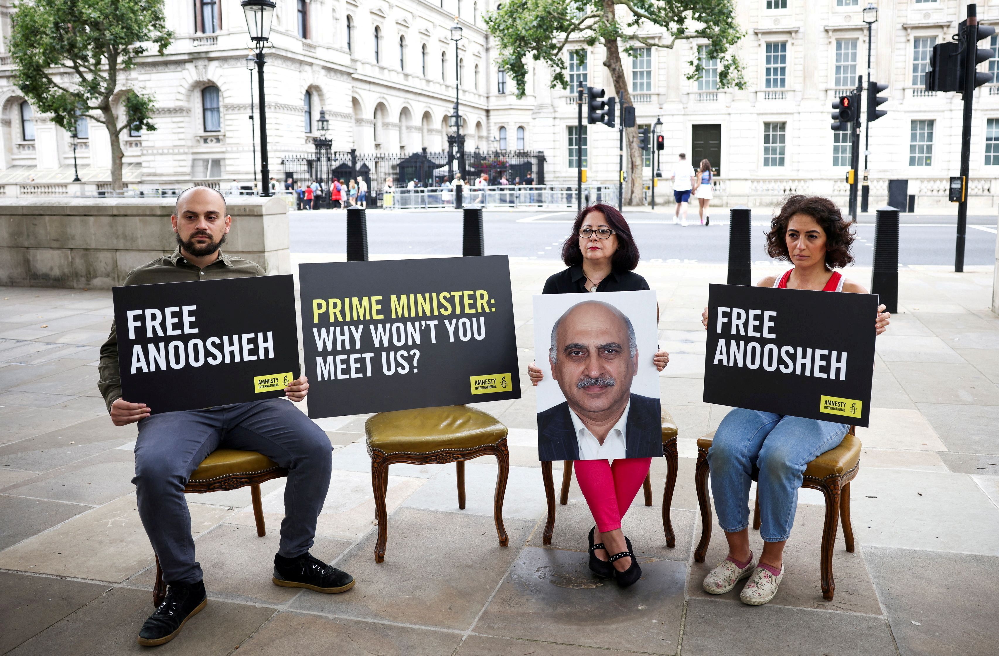 From left, family members Aryan Ashoori, Sherry Izadi and Elika Ashoori stage an empty chair protest opposite Downing Street, on the 4th anniversary of Anoosheh Ashoori's imprisonment, in London on August 13, 2021. Reuters