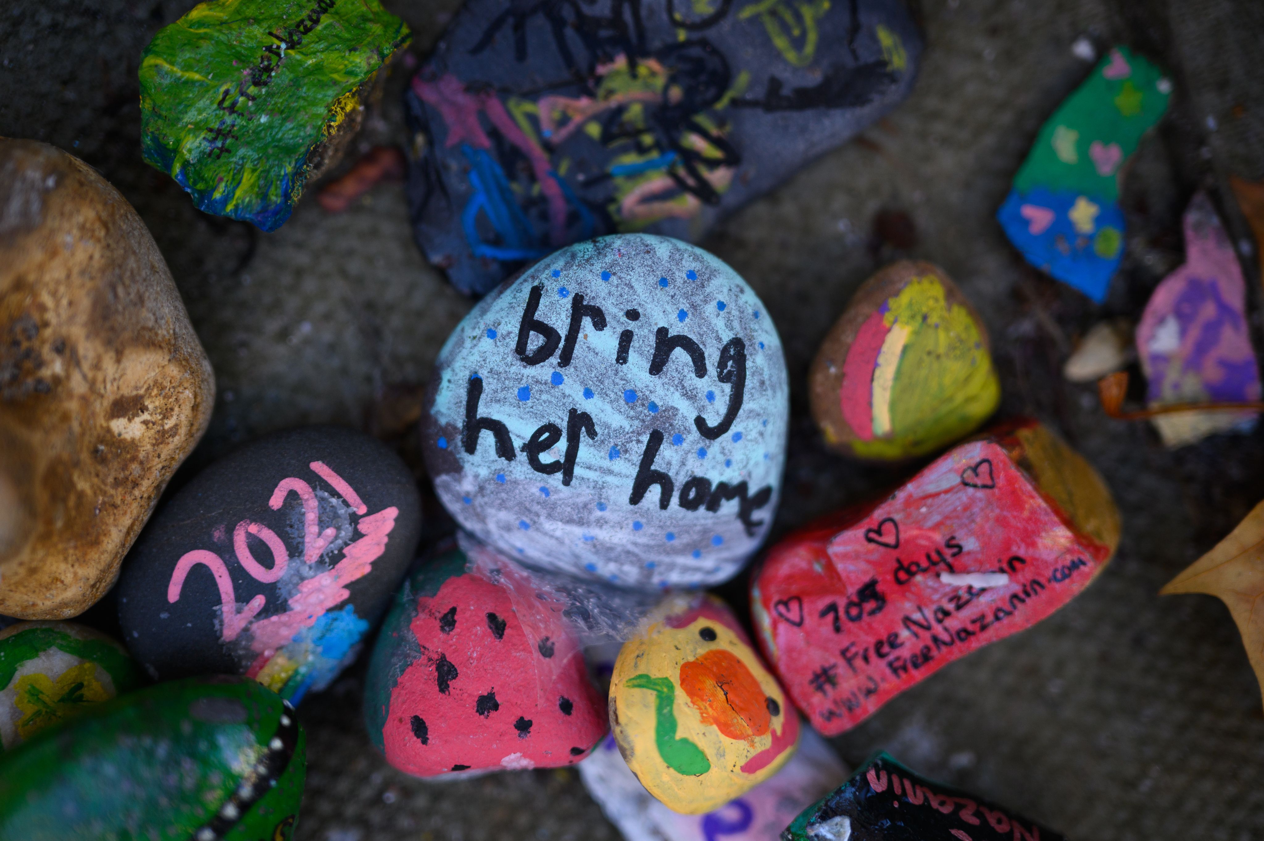 Hand-painted messages of support on stones in the temporary camp where Richard Ratcliffe carried out a hunger strike in 2021 in front of the UK Foreign Office in London. Getty