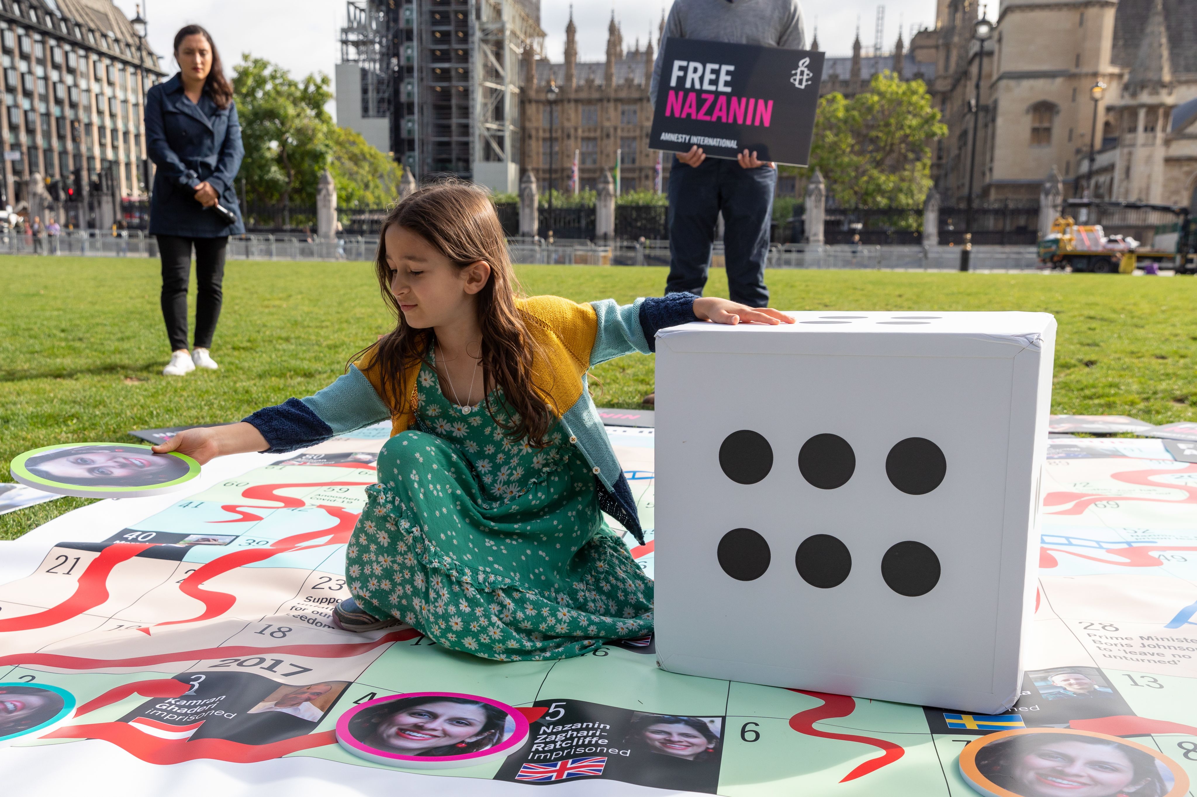 Gabriella Ratcliffe plays a game of giant snakes and ladders in support of her mother, in Parliament Square in London on September 23, 2021 – the 2,000th day of her mother's detention in Iran. EPA