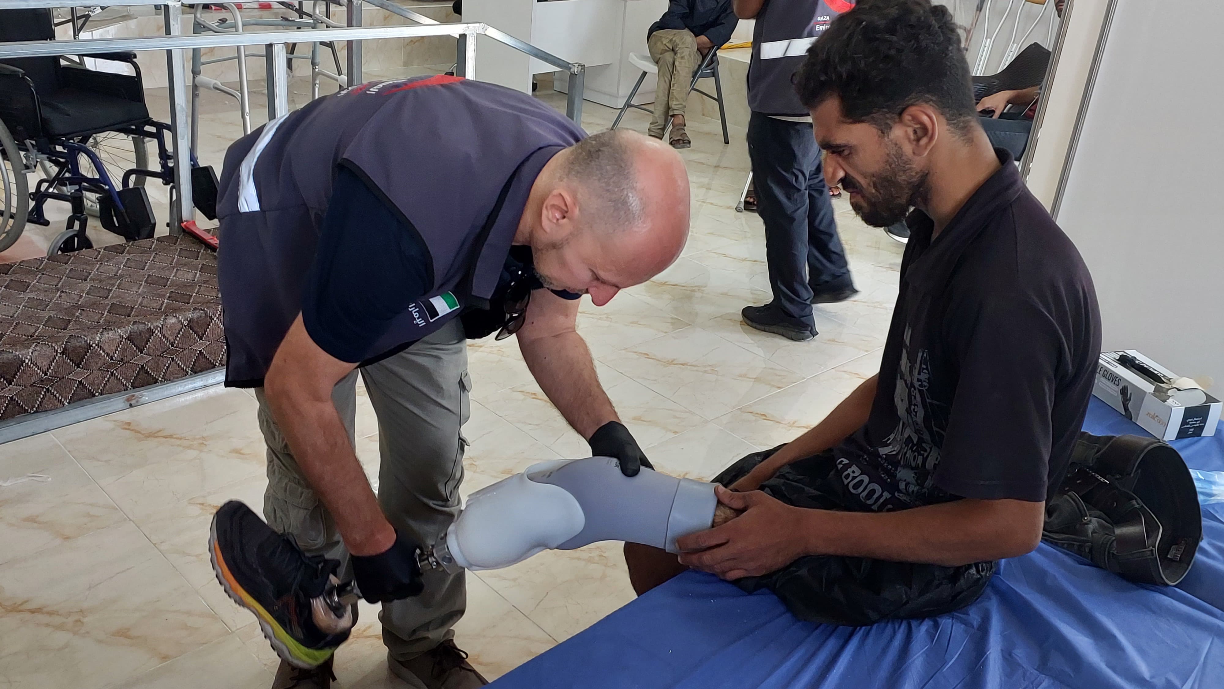 Palestinians who have lost limbs in Israeli attacks try on prosthetics at a centre in Rafah that is funded by Emirates Red Crescent in May 2024. Anadolu