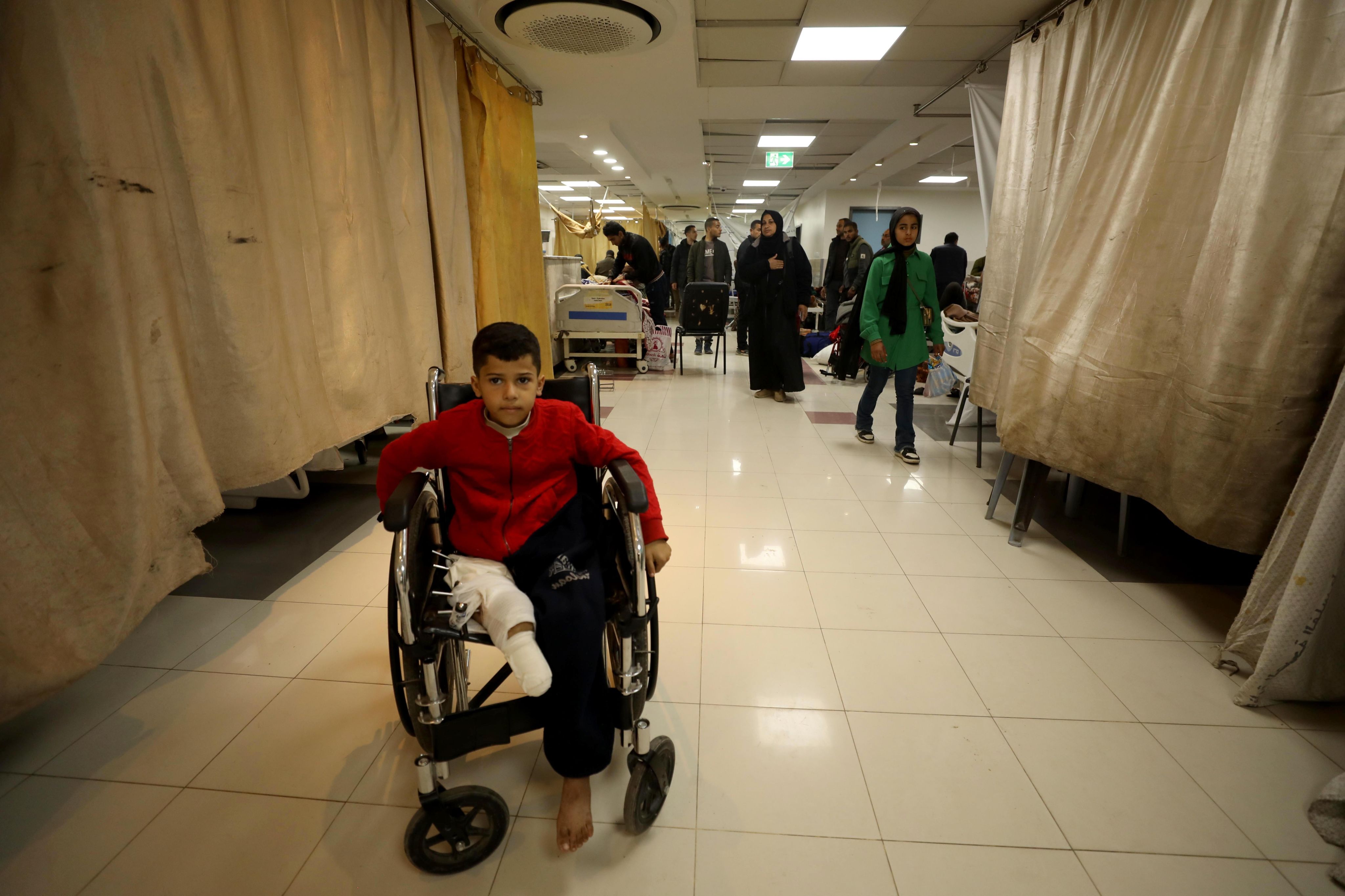 A child amputee in a wheelchair, in the partially damaged Al Shifa Hospital, in February 2024. The hospital in Gaza City was besieged by Israeli forces in October and November 2023. Anadolu