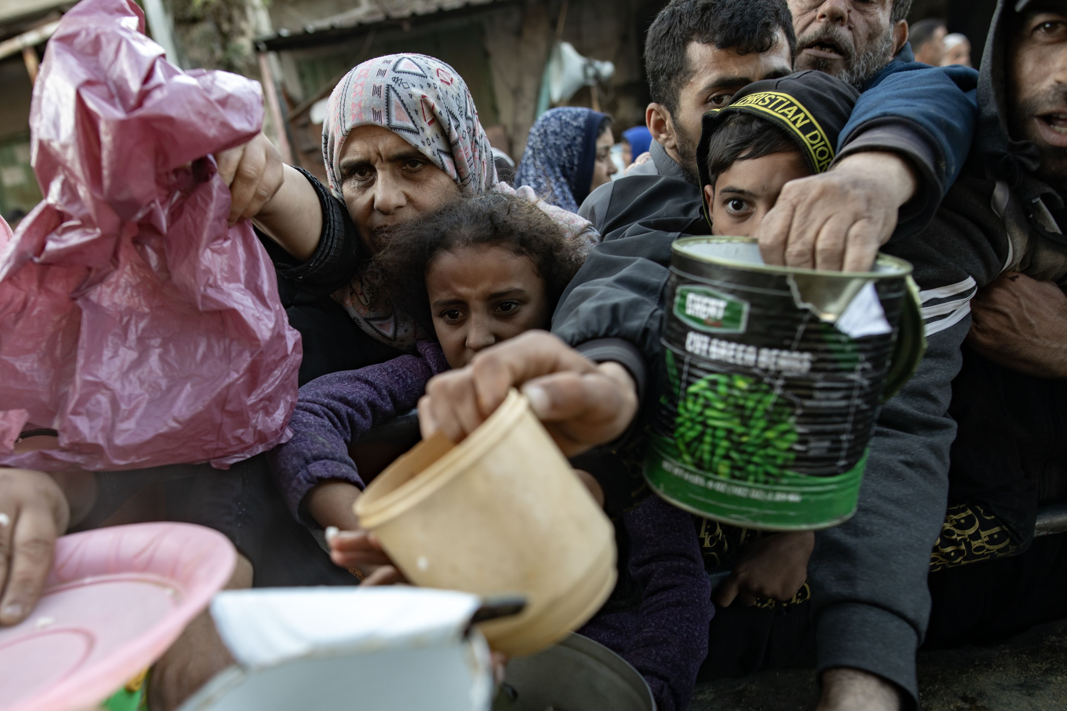 People scramble for cooked food in Rafah. AP