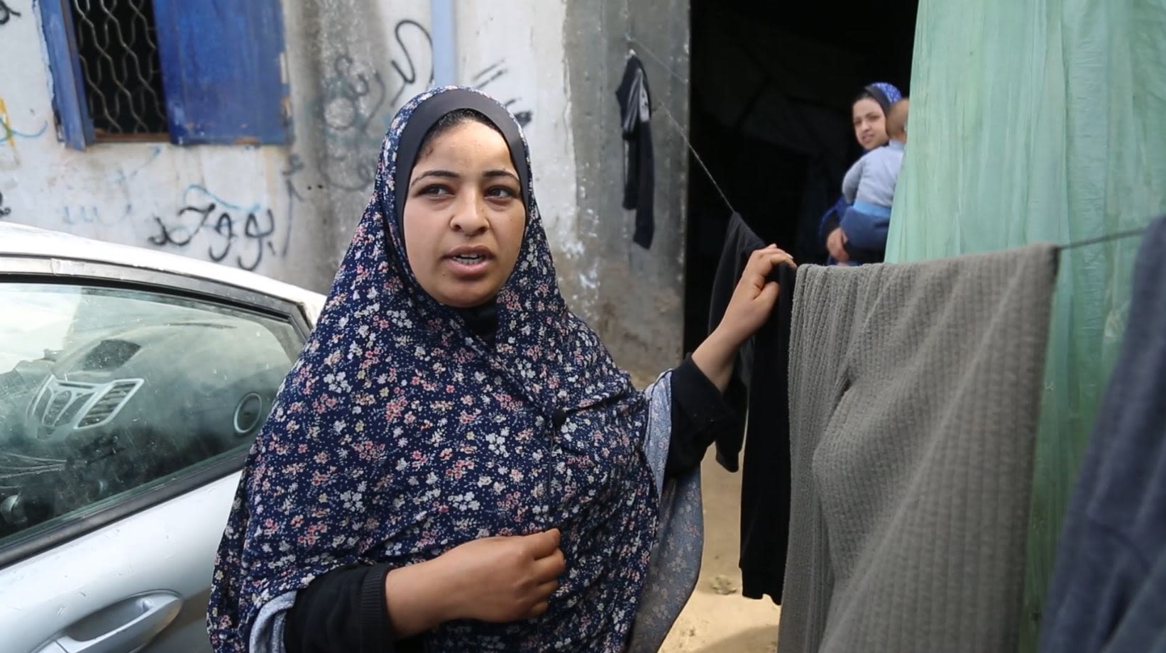 "We didn’t leave like some people with a car, we left on our feet wearing these clothes. I spent the winter in the shirt I'm wearing and one other and the other one is slightly thicker, and this burnous," she says pulling at her headscarf. "I left Beit Hanoun wearing this. Every night I wash it and I wake up the next morning and wear it."