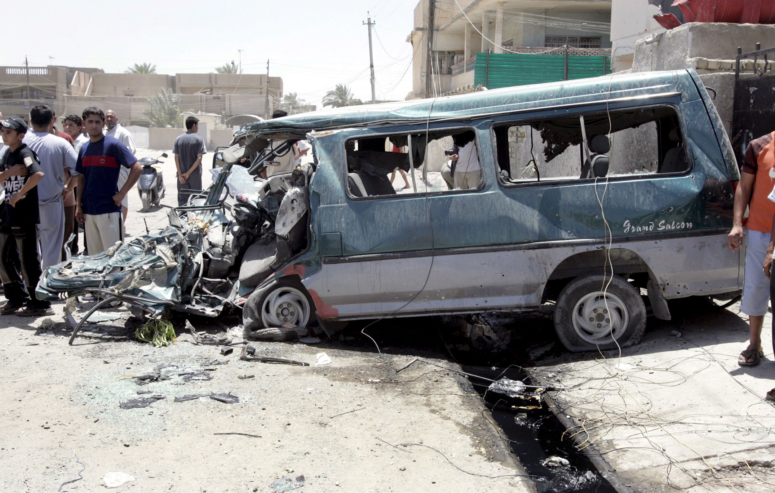 Burnt-out vehicles at the scene of a bombing that killed 22 people in south-east Baghdad on July 24, 2005. AFP