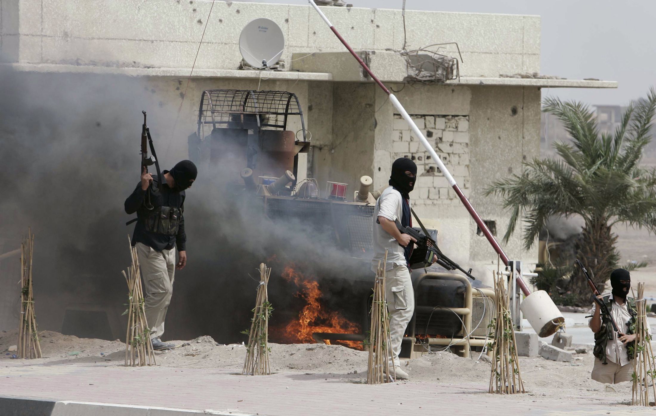 Jaish Al Mahdi fighters stand guard next to a burning Iraqi army vehicle in Basra on March 30, 2008. Reuters
