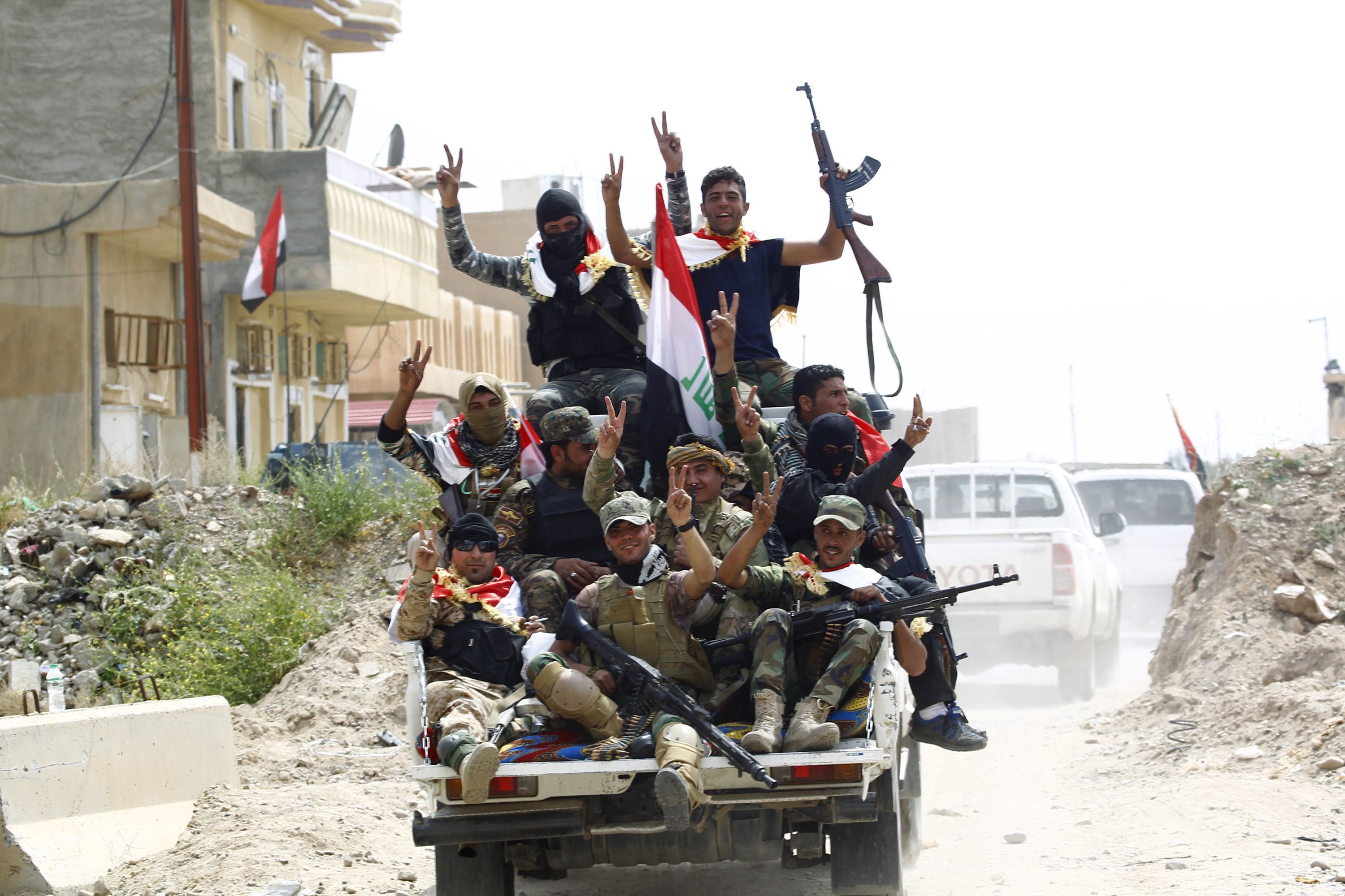 Shiite paramilitary fighters gesture from the back of vehicle in Tikrit, where they are fighting ISIS, on April 1, 2015. Reuters