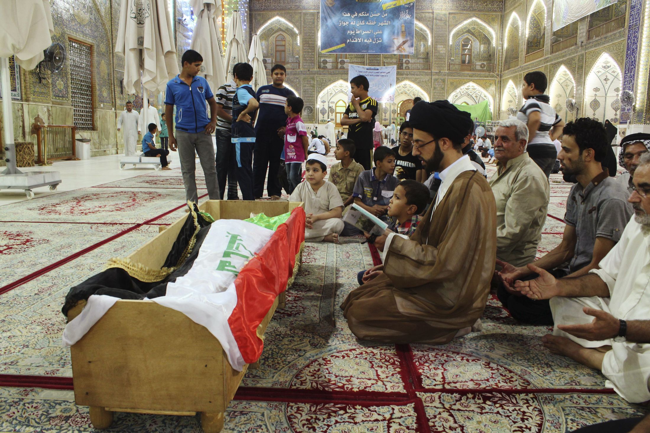 Mourners pray at the coffin of a victim killed in an attack on a prison in Taji, during a funeral at the Imam Ali shrine in Najaf on July 22, 2013. Reuters