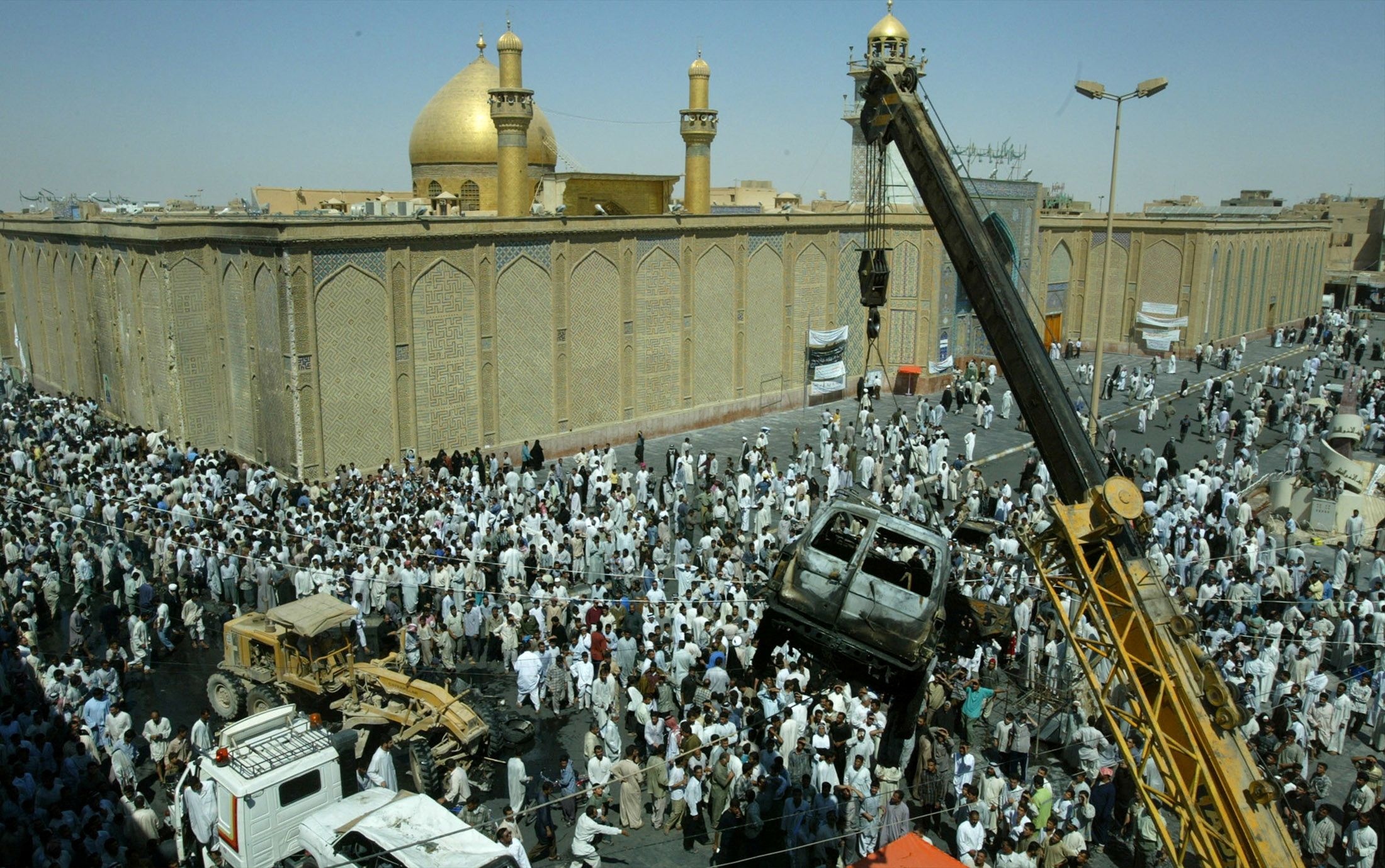 A burnt-out car is removed from outside a Shiite mosque in Najaf, Iraq, on August 30, 2003, a day after 87 people were killed in a car bomb attack. Reuters