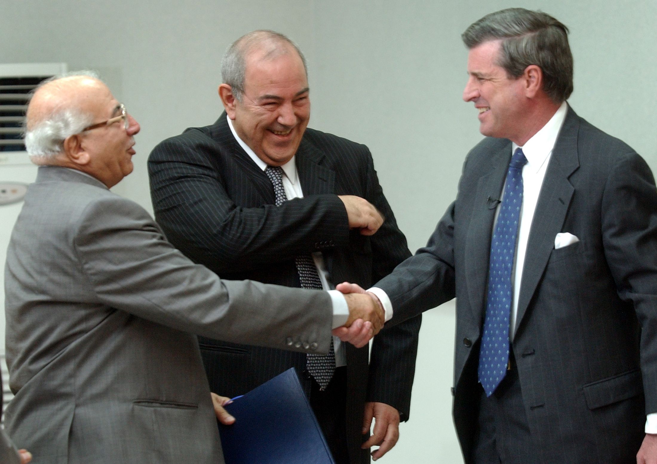 US administrator in Iraq Paul Bremer (R), Iraqi Prime Minister Ayad Allawi (C) and the country's most senior judge Midhat Mahmoud (L) smile as the US transfers sovereignty to Iraq on June 28, 2004, in Baghdad. Reuters