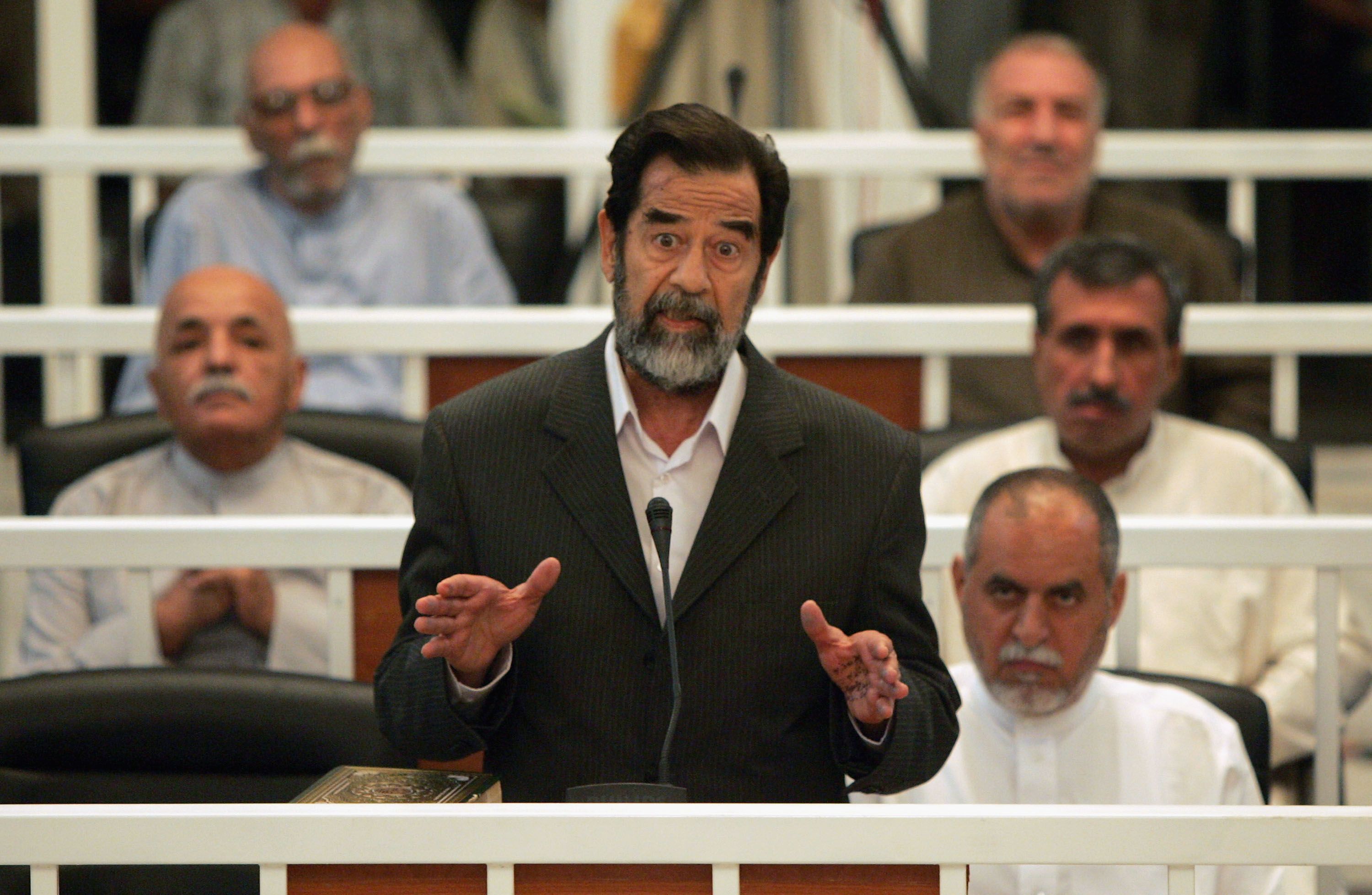 Saddam Hussein speaks defiantly as his trial begins in Baghdad's heavily fortified Green Zone on October 19, 2005. Getty