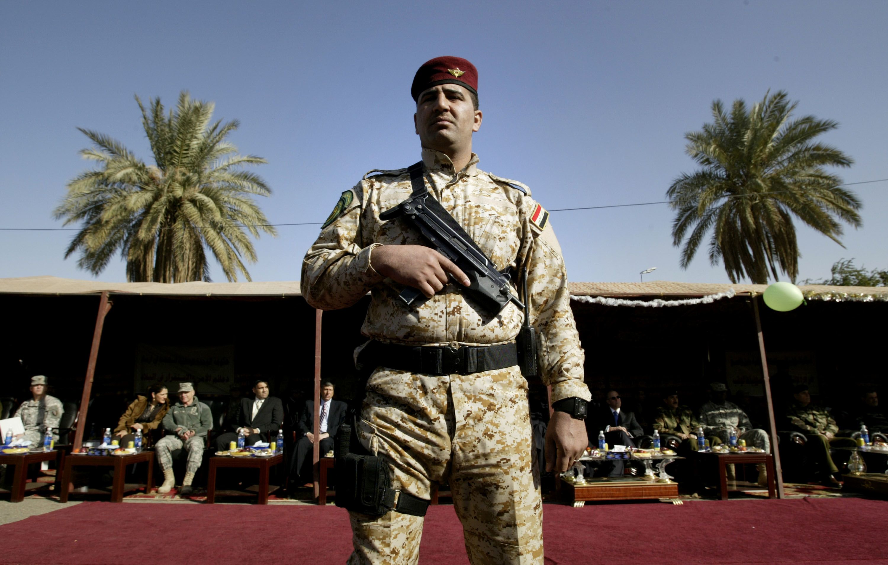 An Iraqi soldier stands guard at the Green Zone handover ceremony on January 1, 2009 in Baghdad. Getty