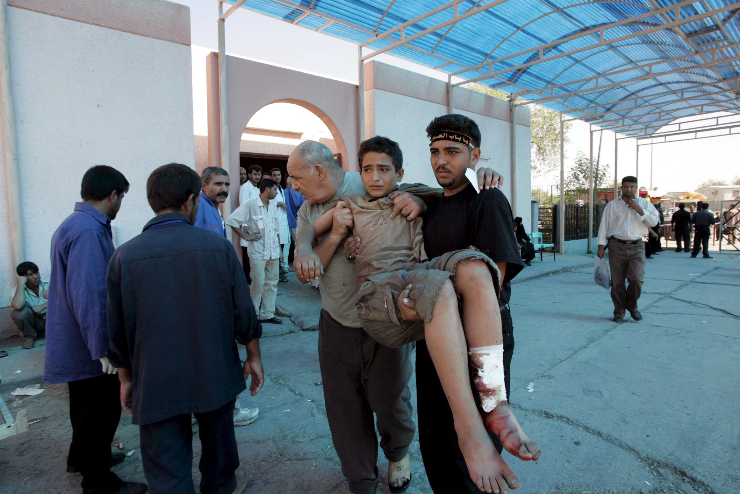 An injured child is carried to a Baghdad hospital after a stampede at the Al Kadhimiya holy shrine killed hundreds of Shiite pilgrims on August 31, 2005. EPA