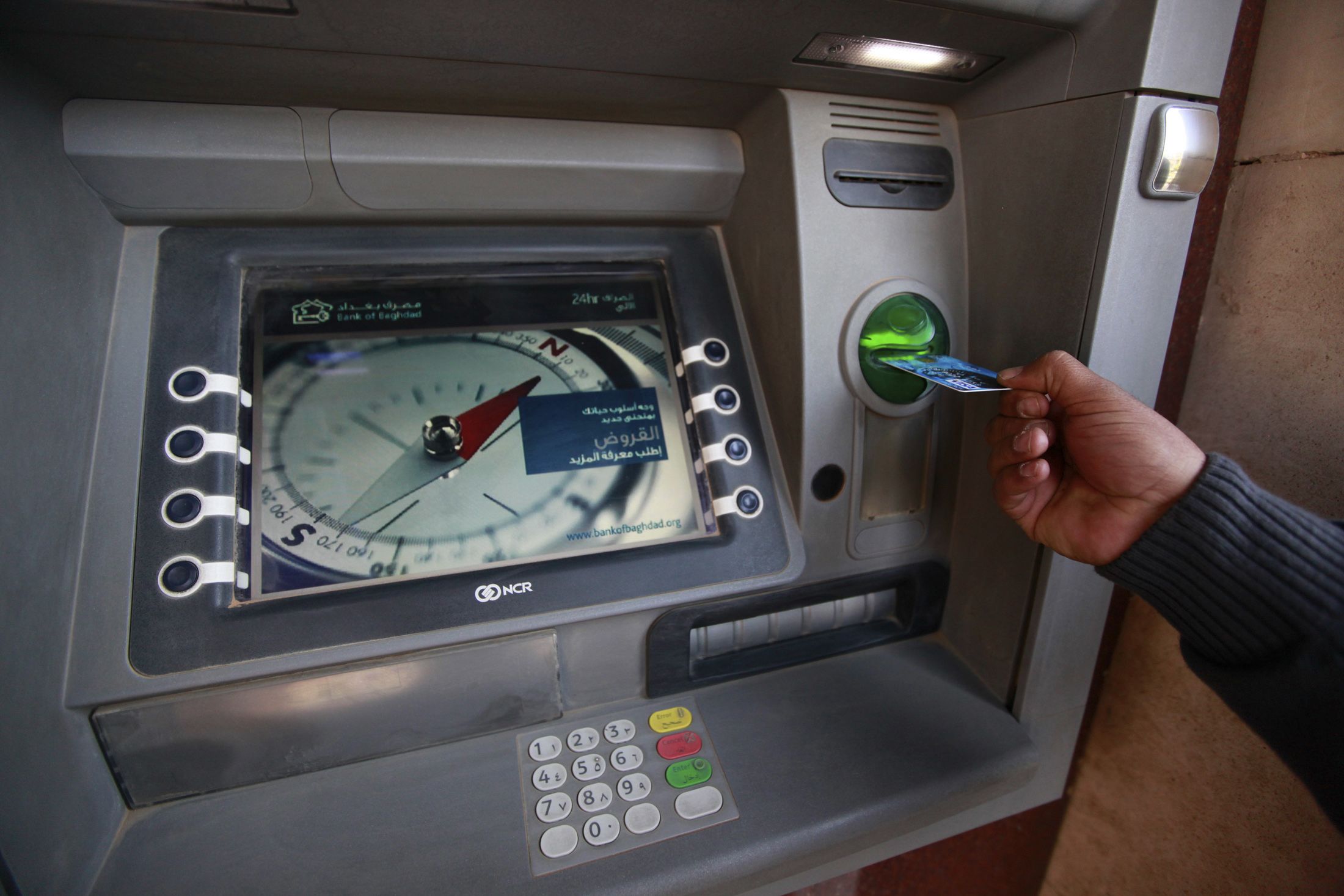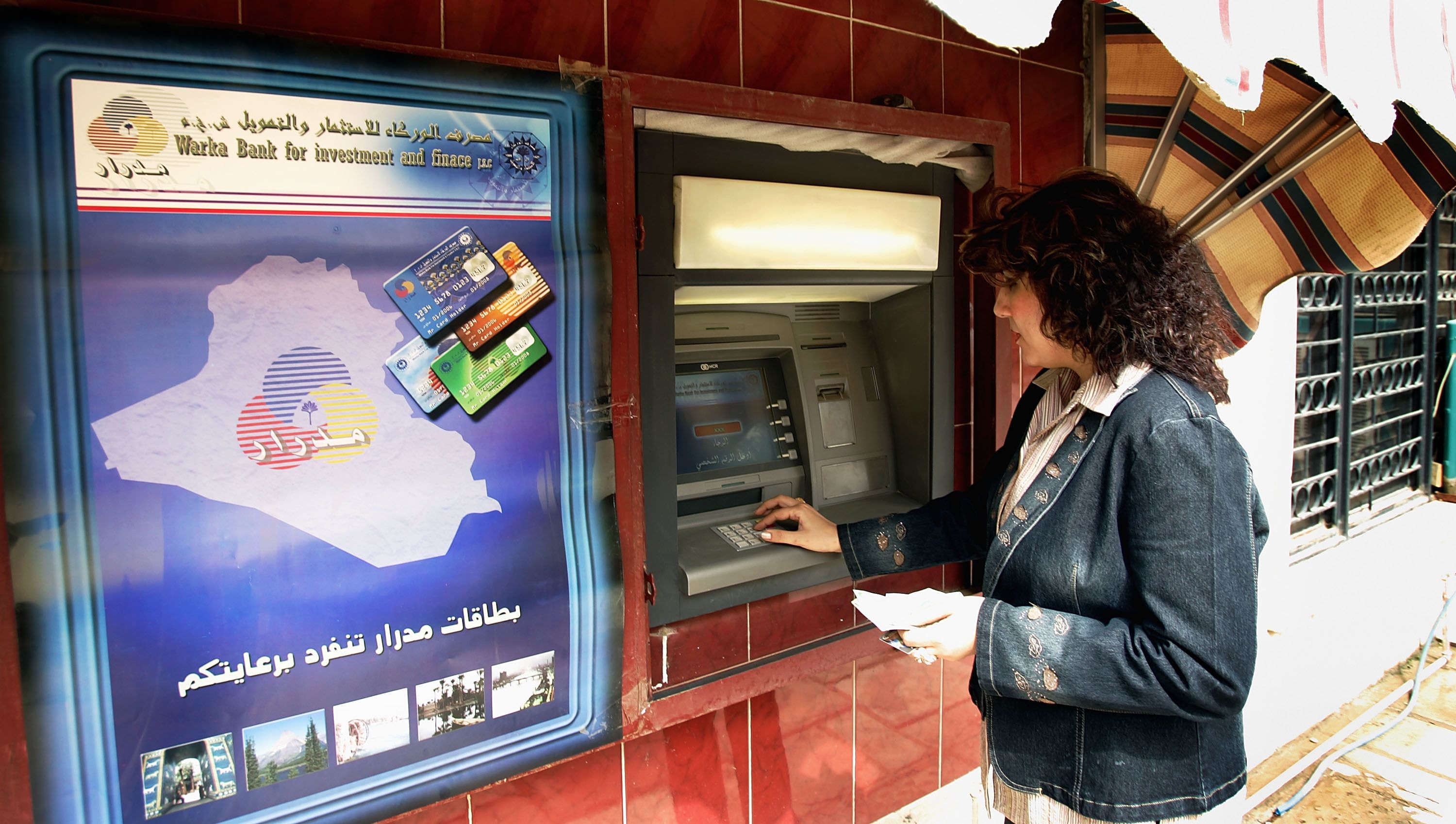 A woman using a cash machine in March 2008, as banks in Iraq began issuing debit and credit cards to encourage cashless payments. Getty Images