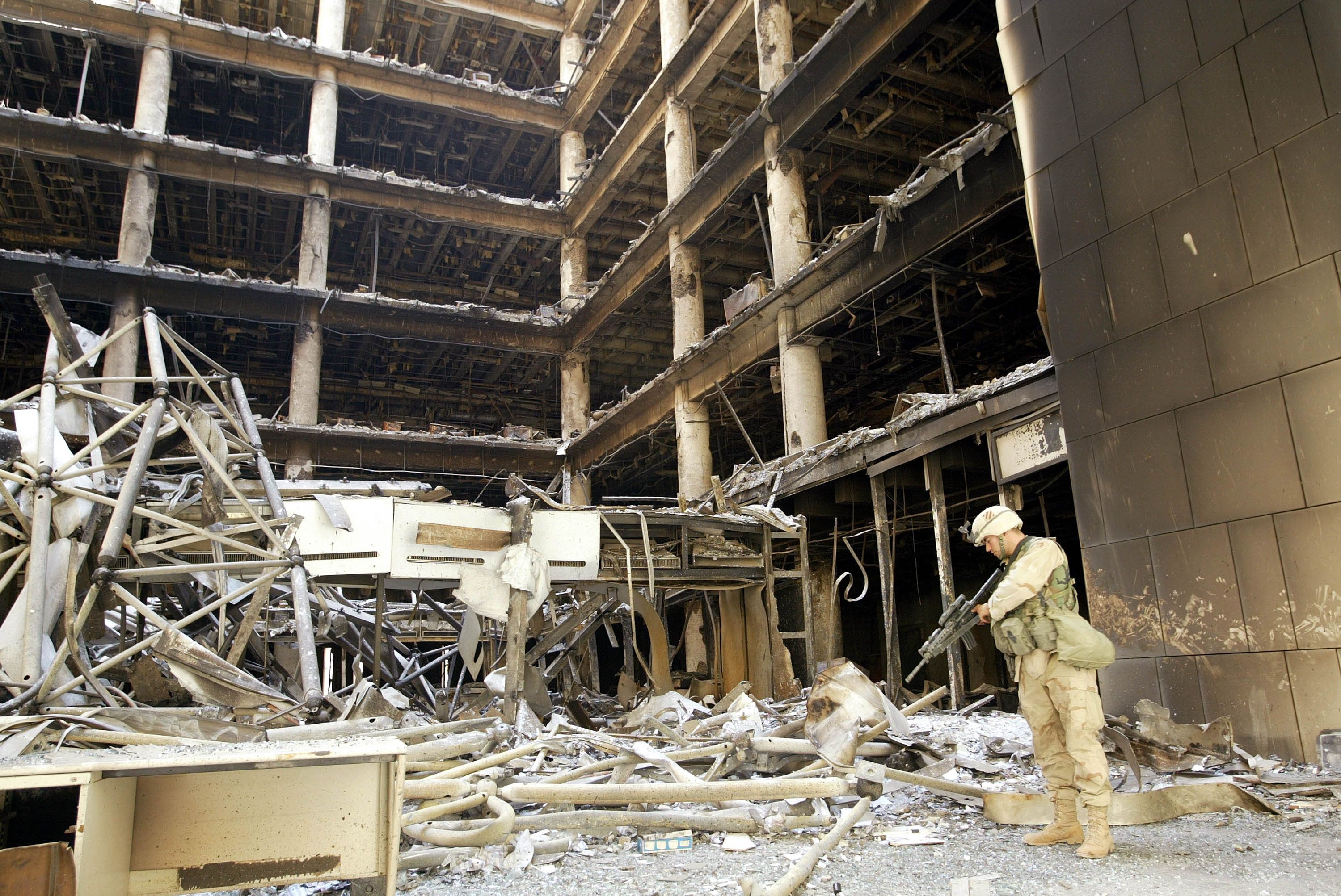 Baghdad's Central Bank destroyed by an American bomb during the US-led war on Iraq, in April 2003. Getty Images