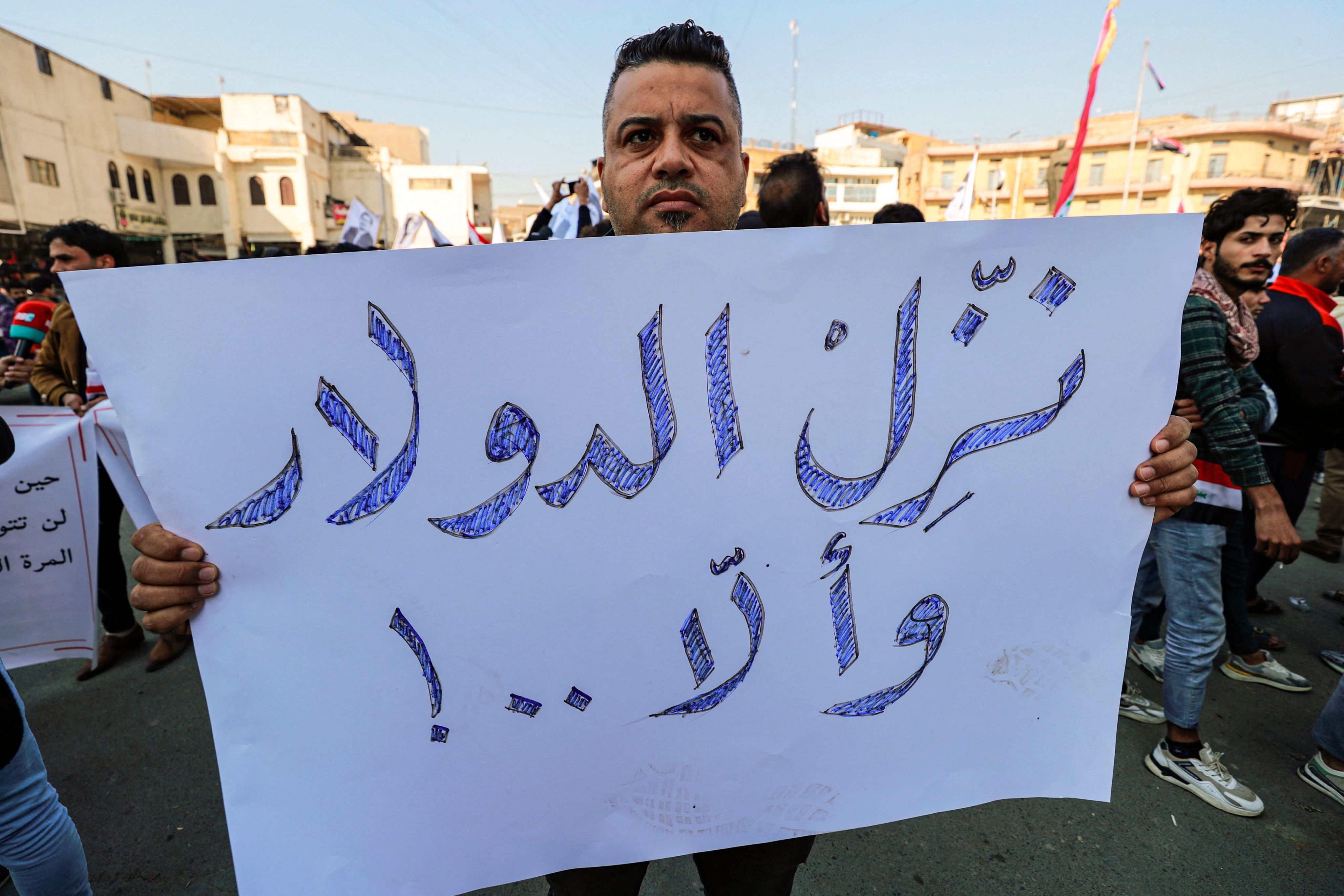 A man holds a sign reading 'depreciate the rate of the [US] dollar, or else...' during a protest outside the Central Bank of Iraq in Baghdad in 2023. AFP