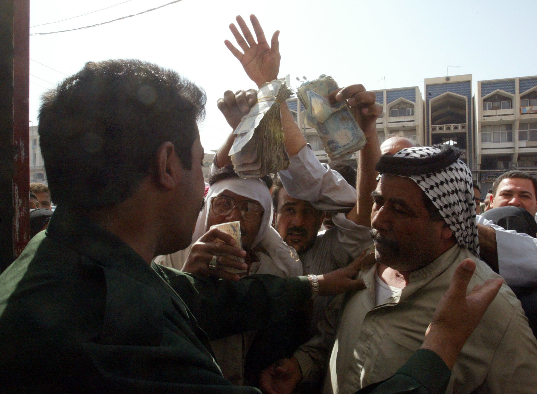Iraqis try to enter a bank in Najaf to exchange 10,000 dinar bills for 250 dinar bills. The larger bills dropped in value after many were stolen from the central bank after the war began, in April 2003. Reuters