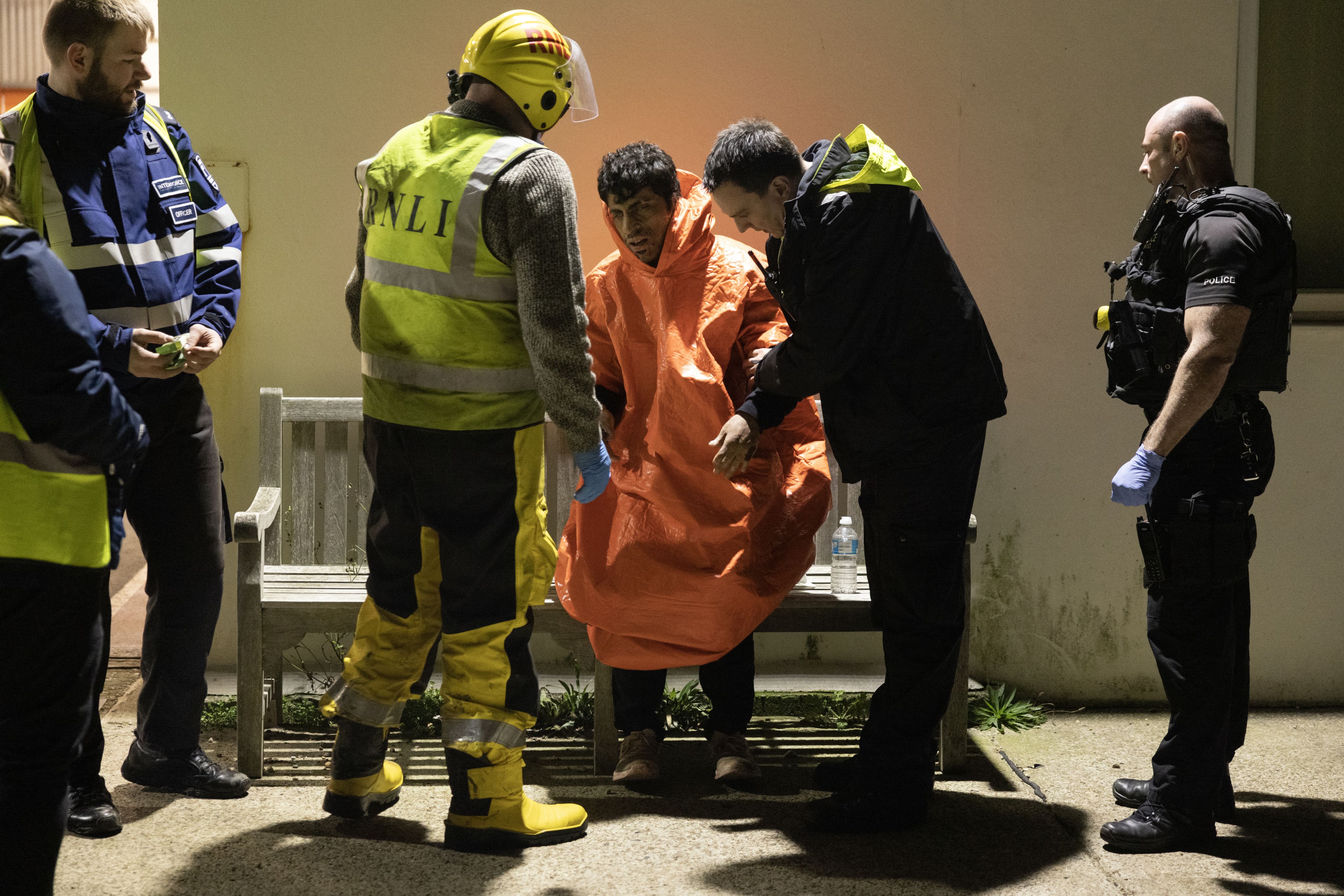 An injured man is escorted by British Border Force officials after being rescued from the English Channel during an attempted crossing in November 2022. Getty Images