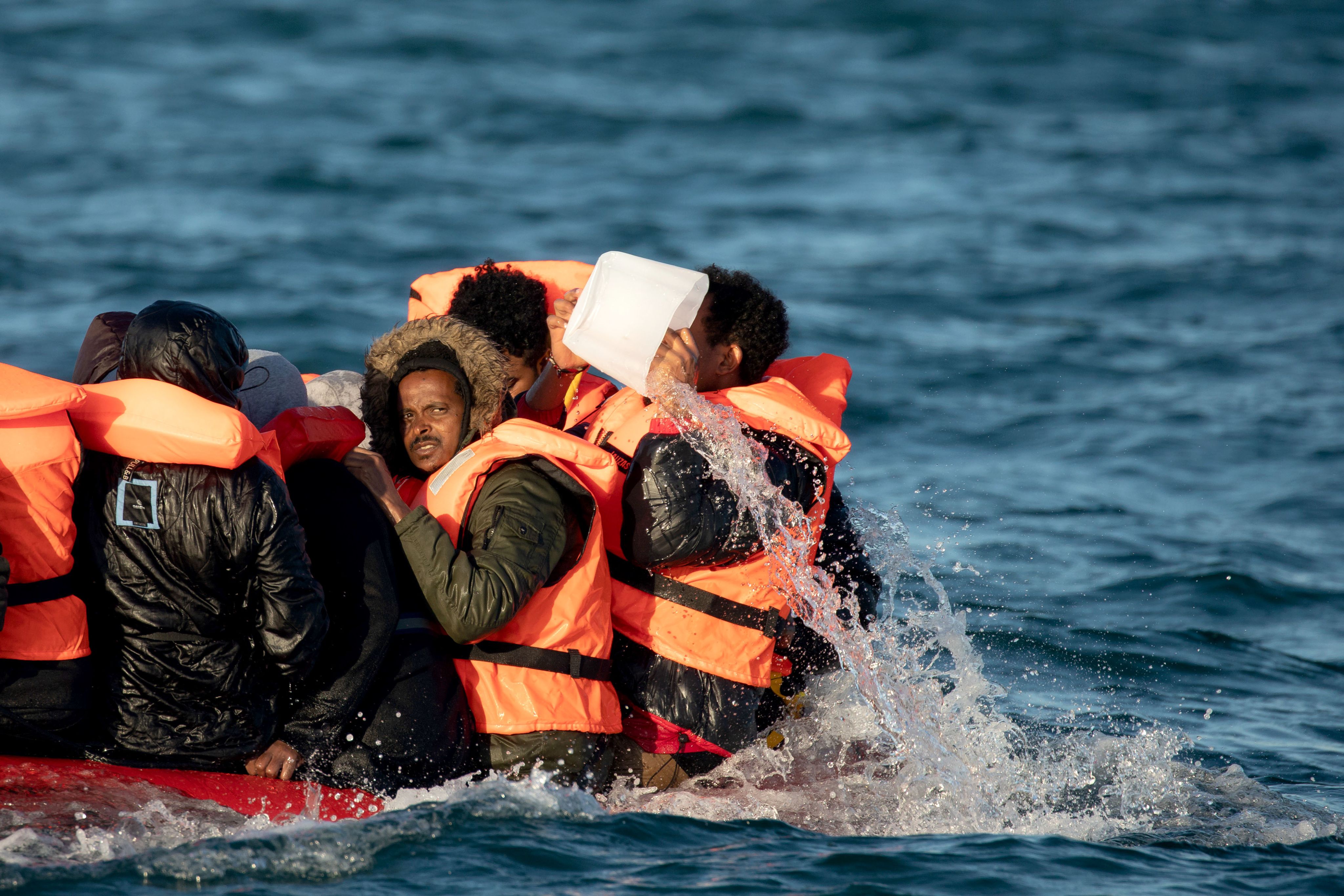 Migrants packed tightly onto a small dinghy bail water out as they attempt to cross the Channel to Dover in September 2020. Getty Images