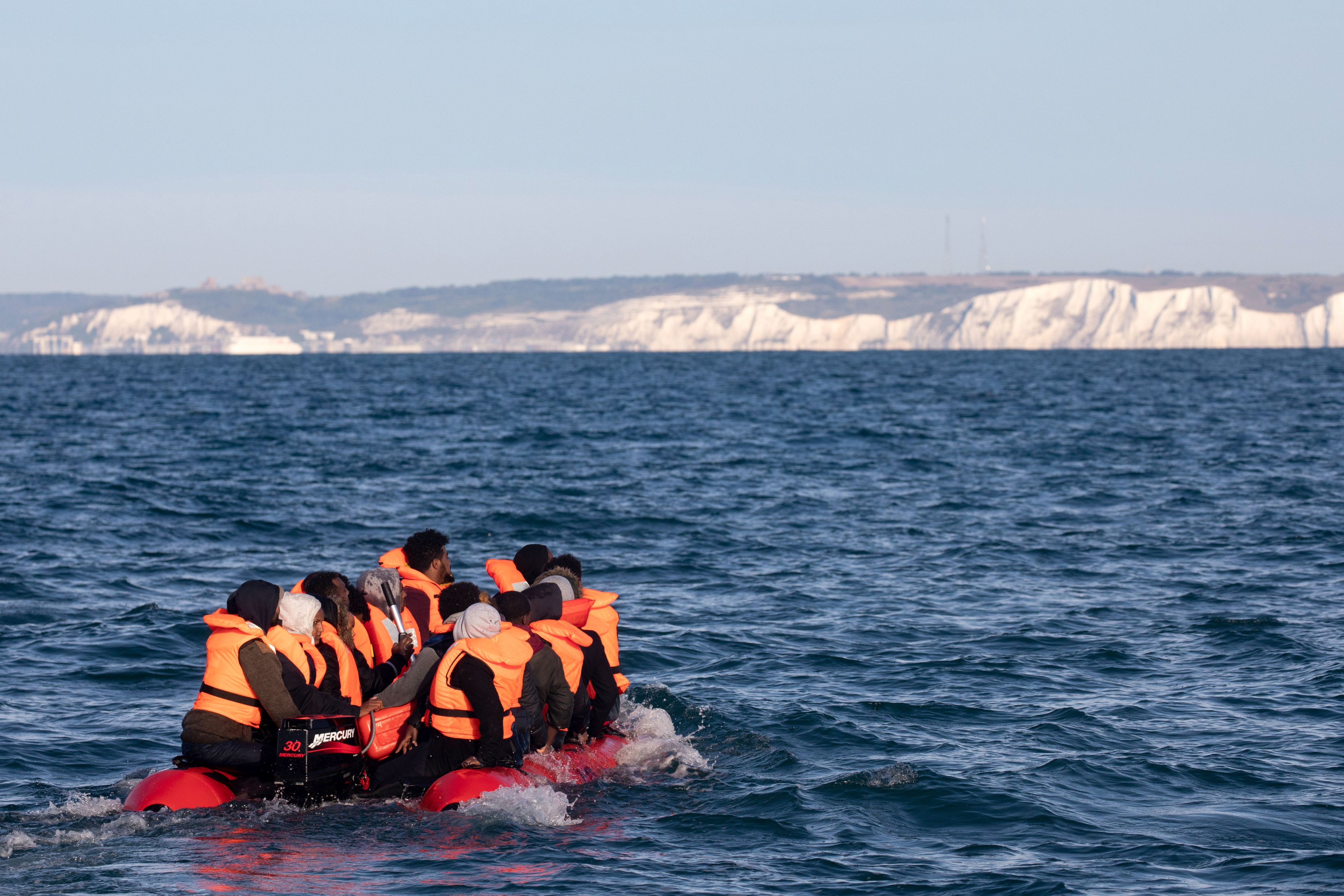 Migrants onboard a dinghy drift into English waters during an attempt to cross the Channel in August 2023. Getty Images