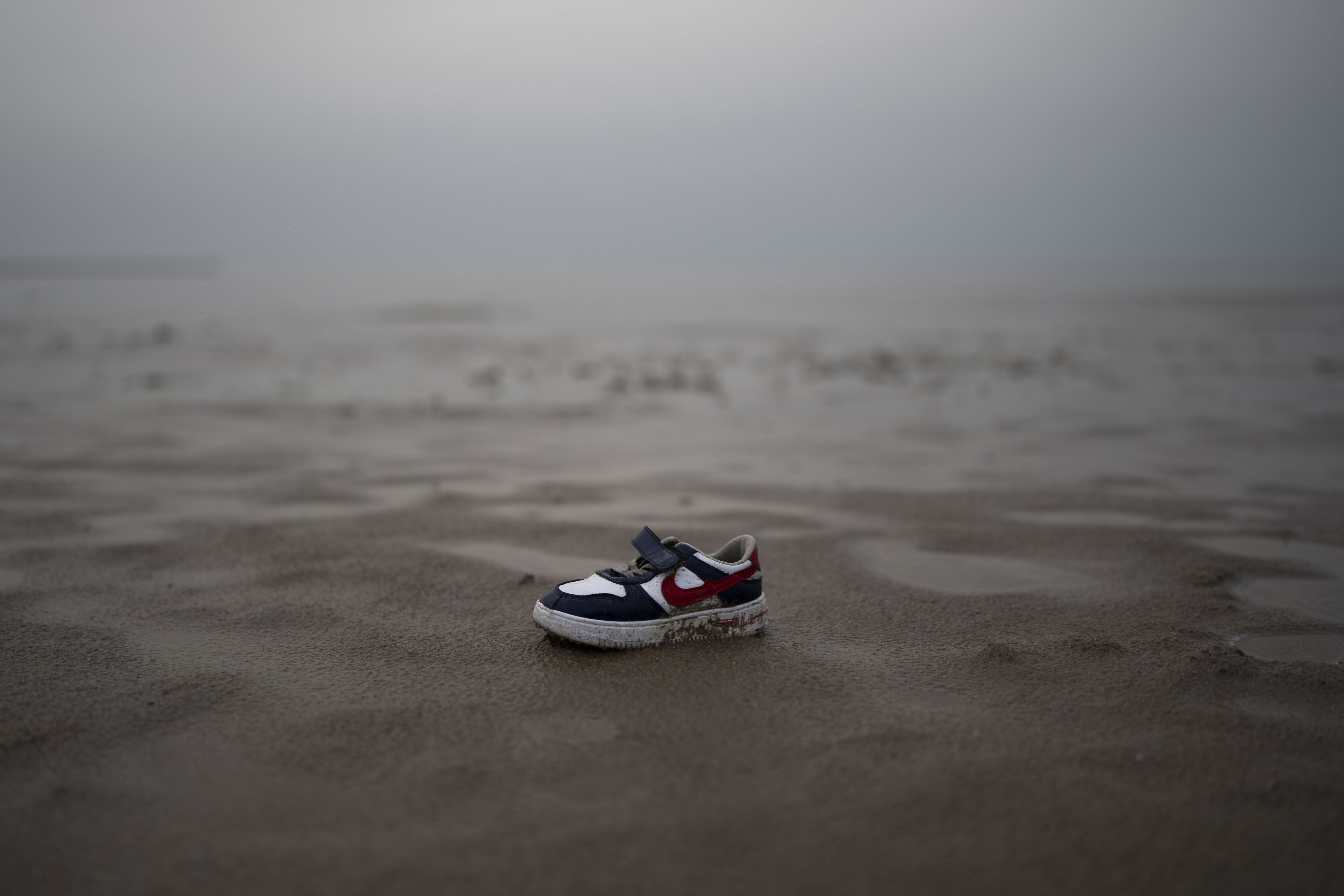 A child's shoe lays on a beach in Dunkirk favoured by migrants to launch their dinghies from to travel to the UK, in November 2022. Getty Images