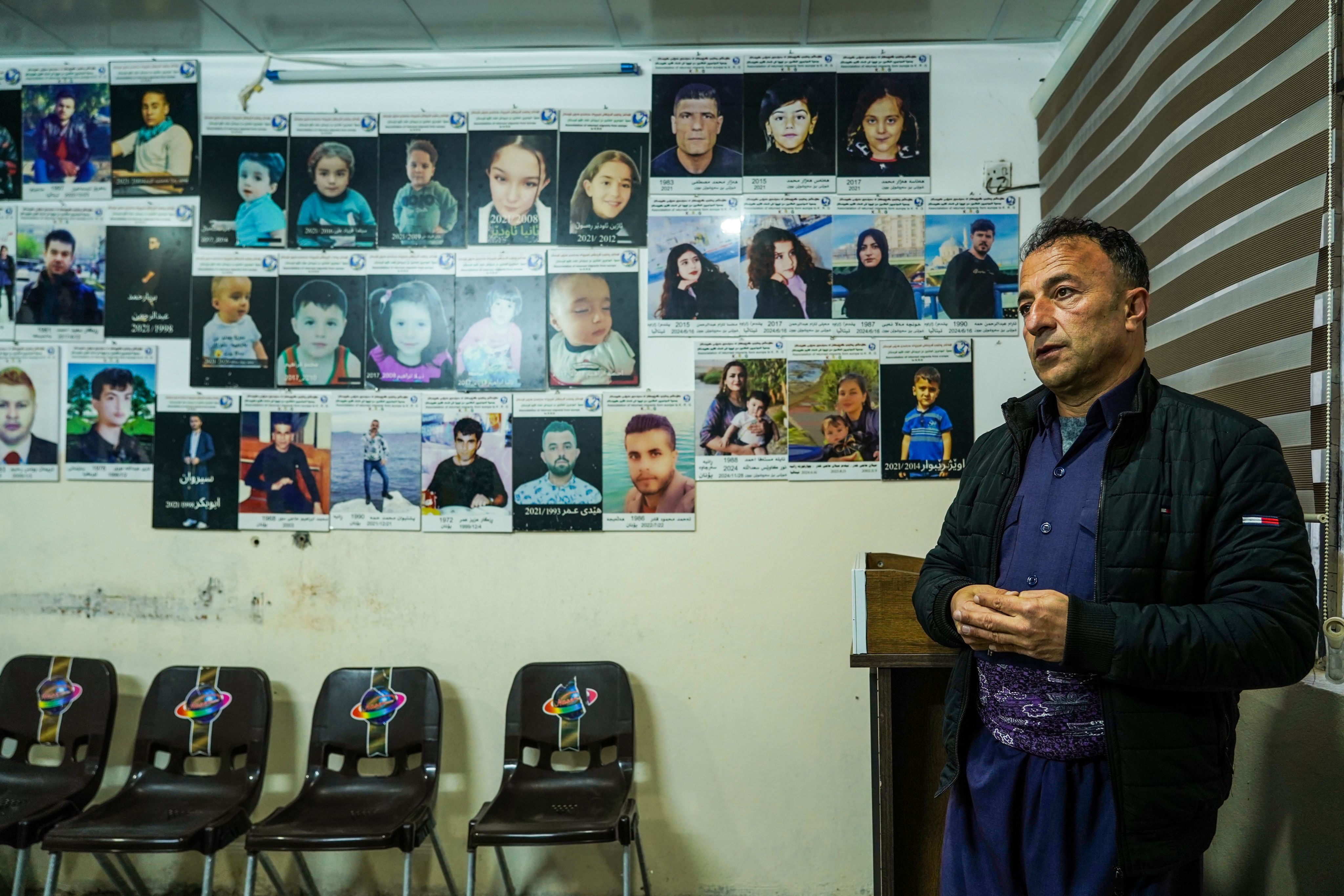 Bakr Ali keeps a memorial wall of the migrants that have died attempting to travel to Europe, in the Association of Migrants Returning from Europe's headquarters in Ranya. Aymen Al-Ameri / The National