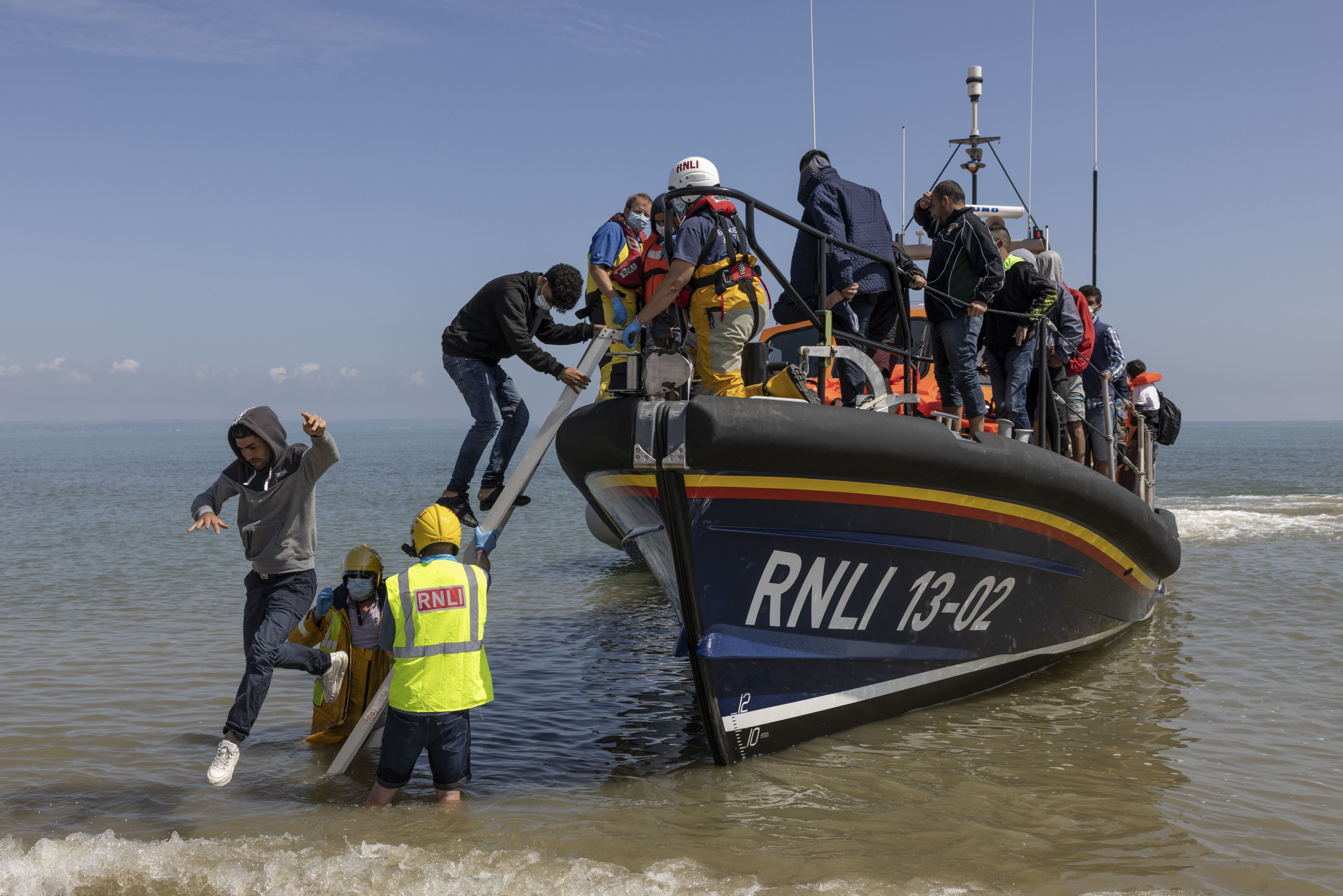 Some 40 migrants arrive on Dungeness beach in August 2021 after being rescued from the Channel by the Royal National Lifeboat Institution. Getty Images