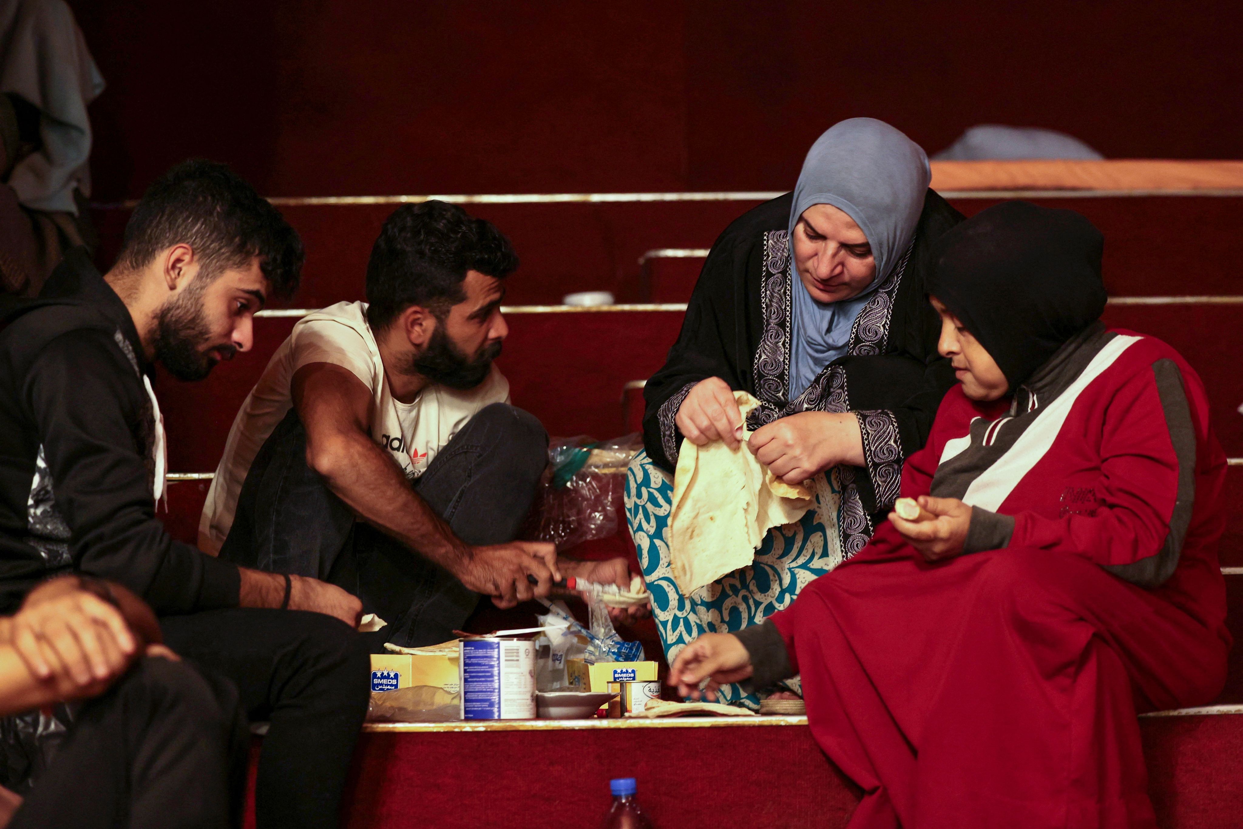 Displaced Syrian families share a meal in an old theatre being used as a shelter in Beirut on October 24. Reuters