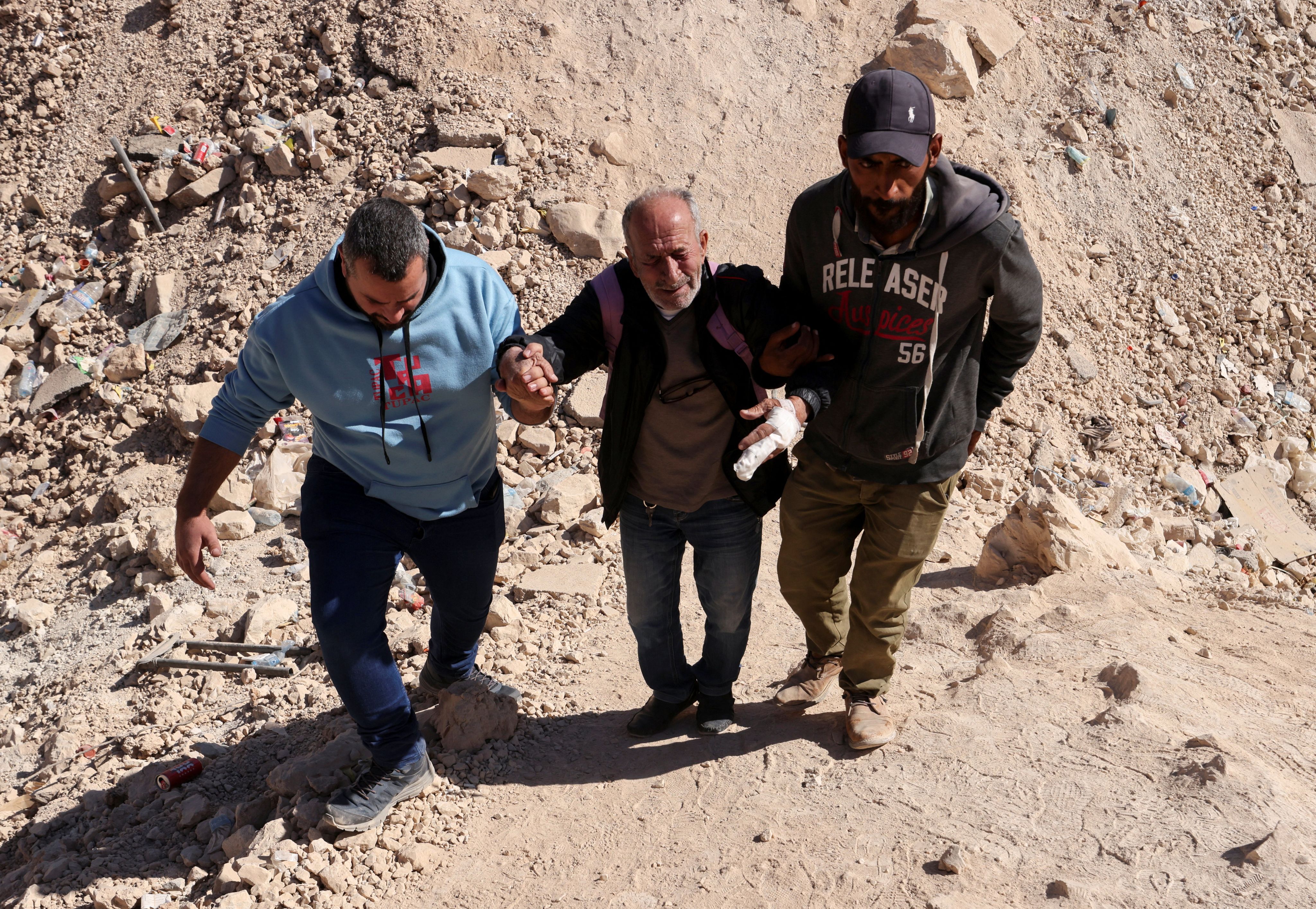 Refugees help a man cross into Syria from Lebanon at the Masnaa border on October 28. Reuters