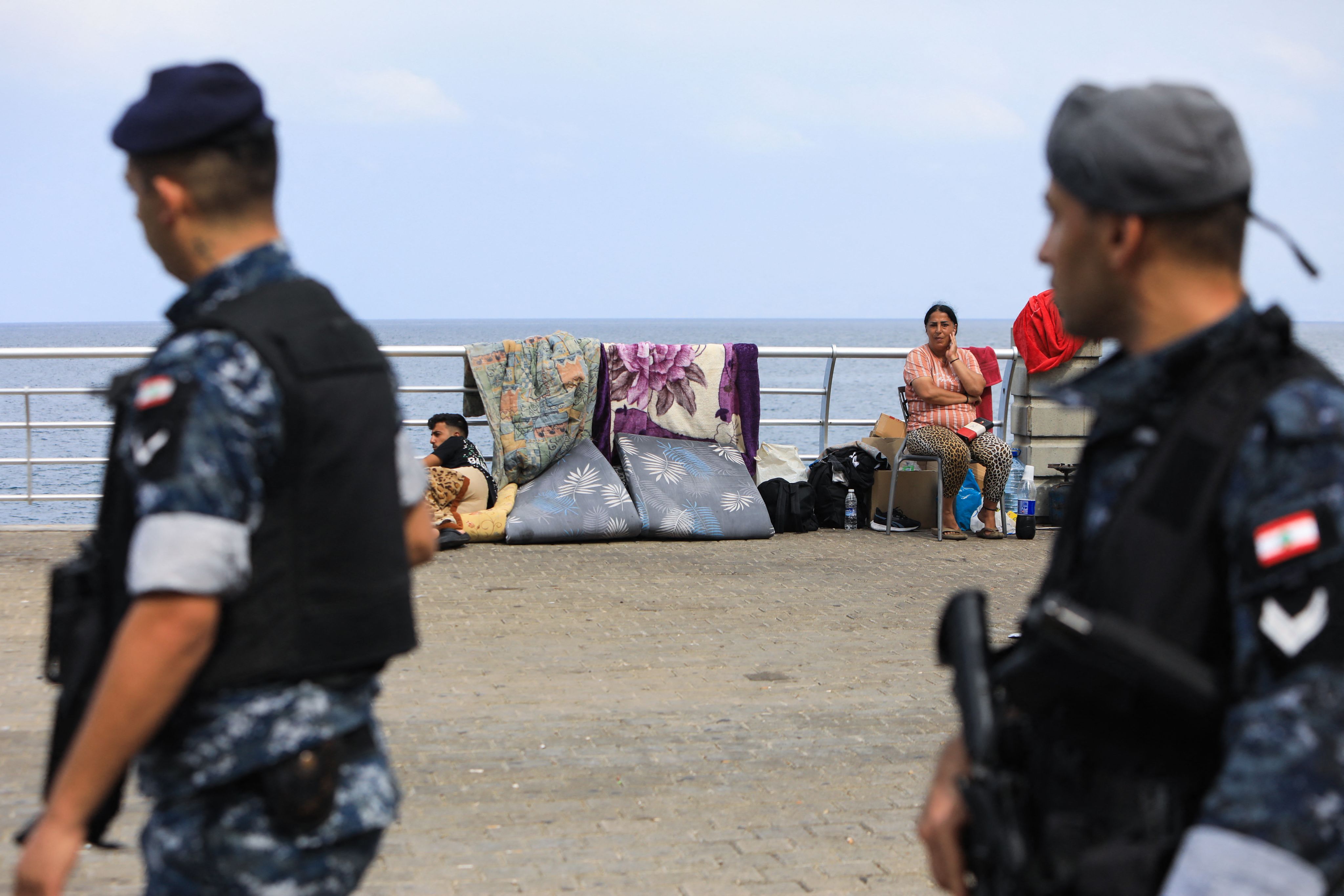 Lebanese security forces check on displaced people living in make-shift shelters along Beirut's seaside promenade on October 10. AFP