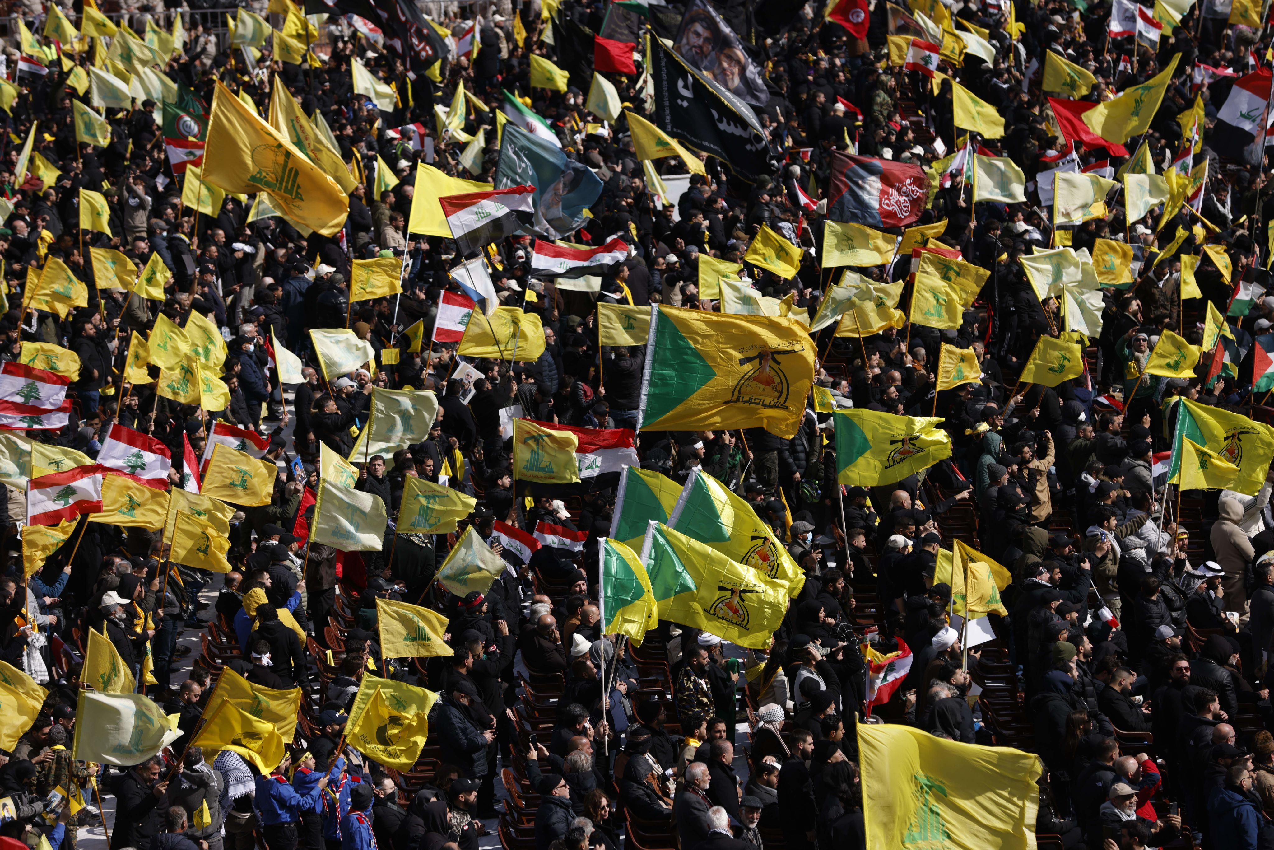 Mourners wave flags of Hezbollah and Lebanon at the funeral of the party's former leader, Hassan Nasrallah, who was killed in an Israeli air strike, in February. Getty Images