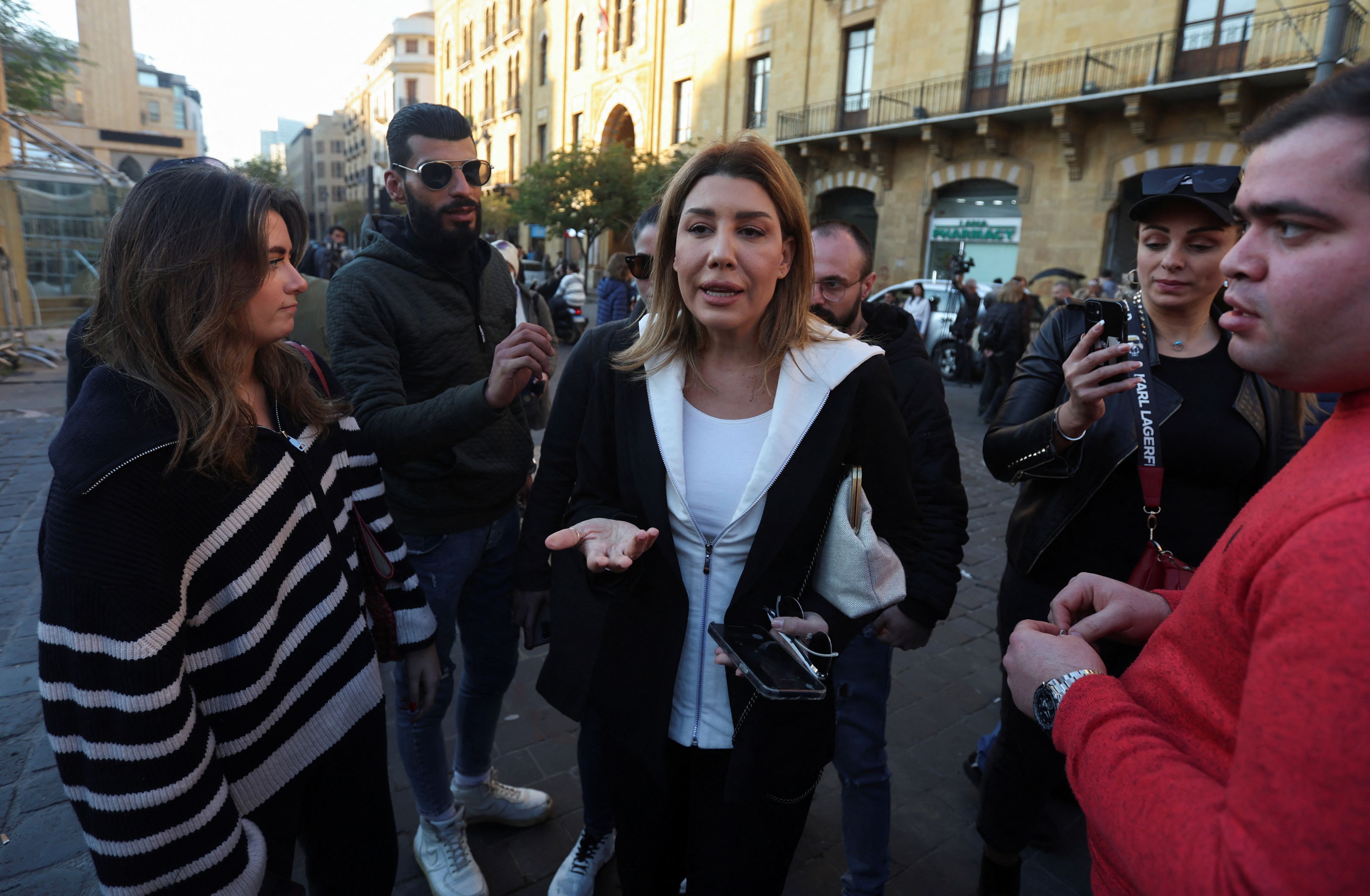 Lebanese MP Paula Yacoubian speaks to demonstrators in Beirut in January 2023. Reuters