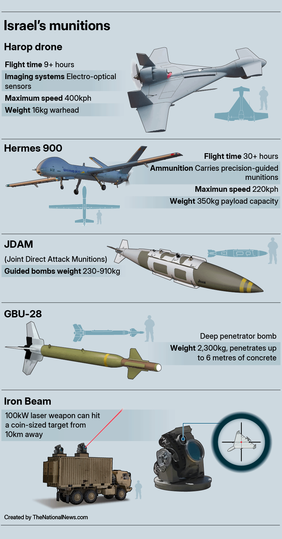 A relatively new weapon is the Harop kamikaze drone, which can loiter for more than nine hours before diving down to strike. It can travel at more than 400kph to hit targets with its 16kg warhead.