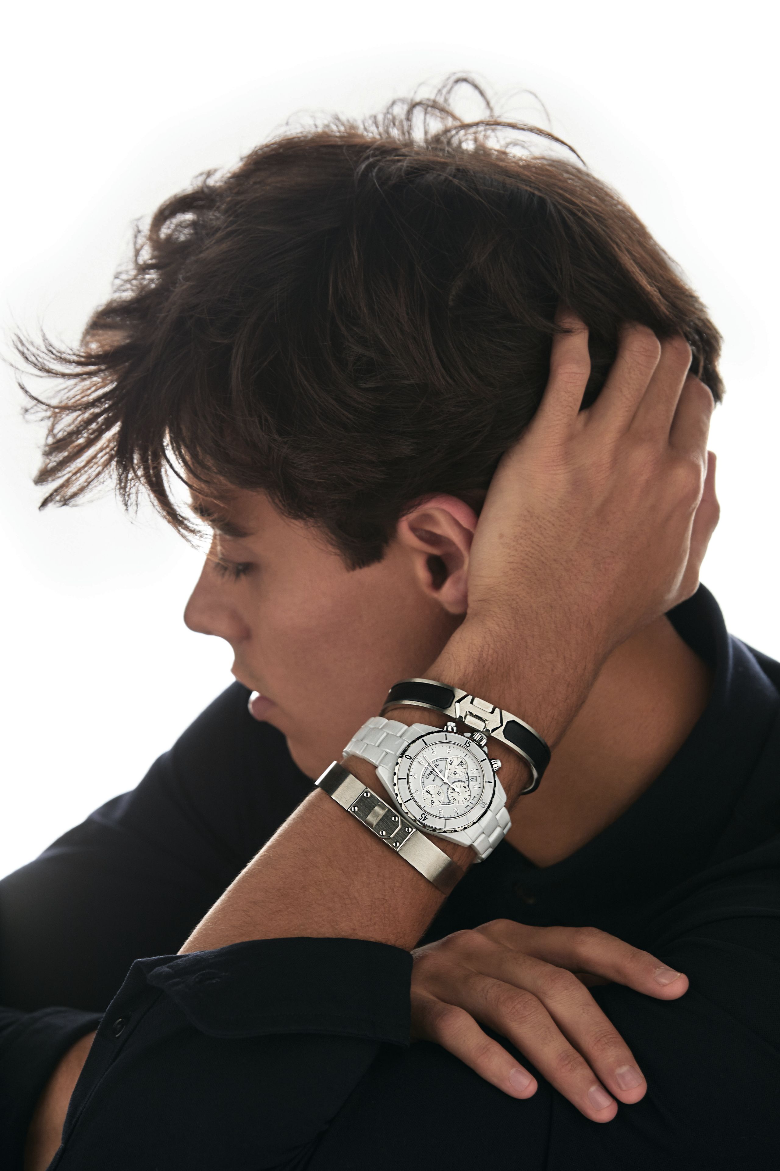 From top, Super H bracelet, Dh2,645, Hermès. J12 chronograph watch in ceramic and steel, Dh38,561, Chanel. Kelly Bracelet Laiton Palladie, Dh2,190, Hermès