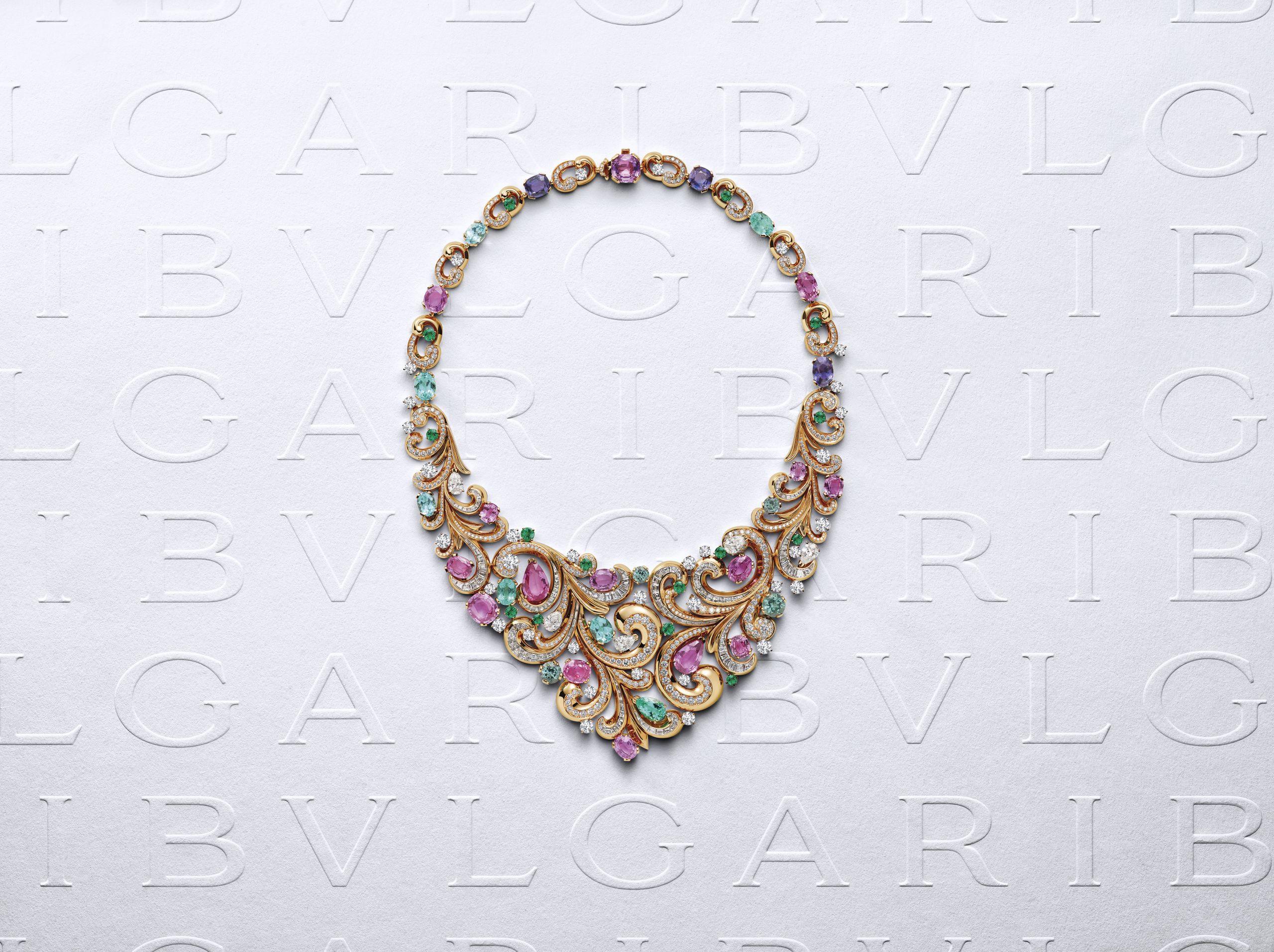 The Bulgari Barocko Arabesque necklace, with pink sapphires and Paraiba tourmalines. Courtesy Bulgari