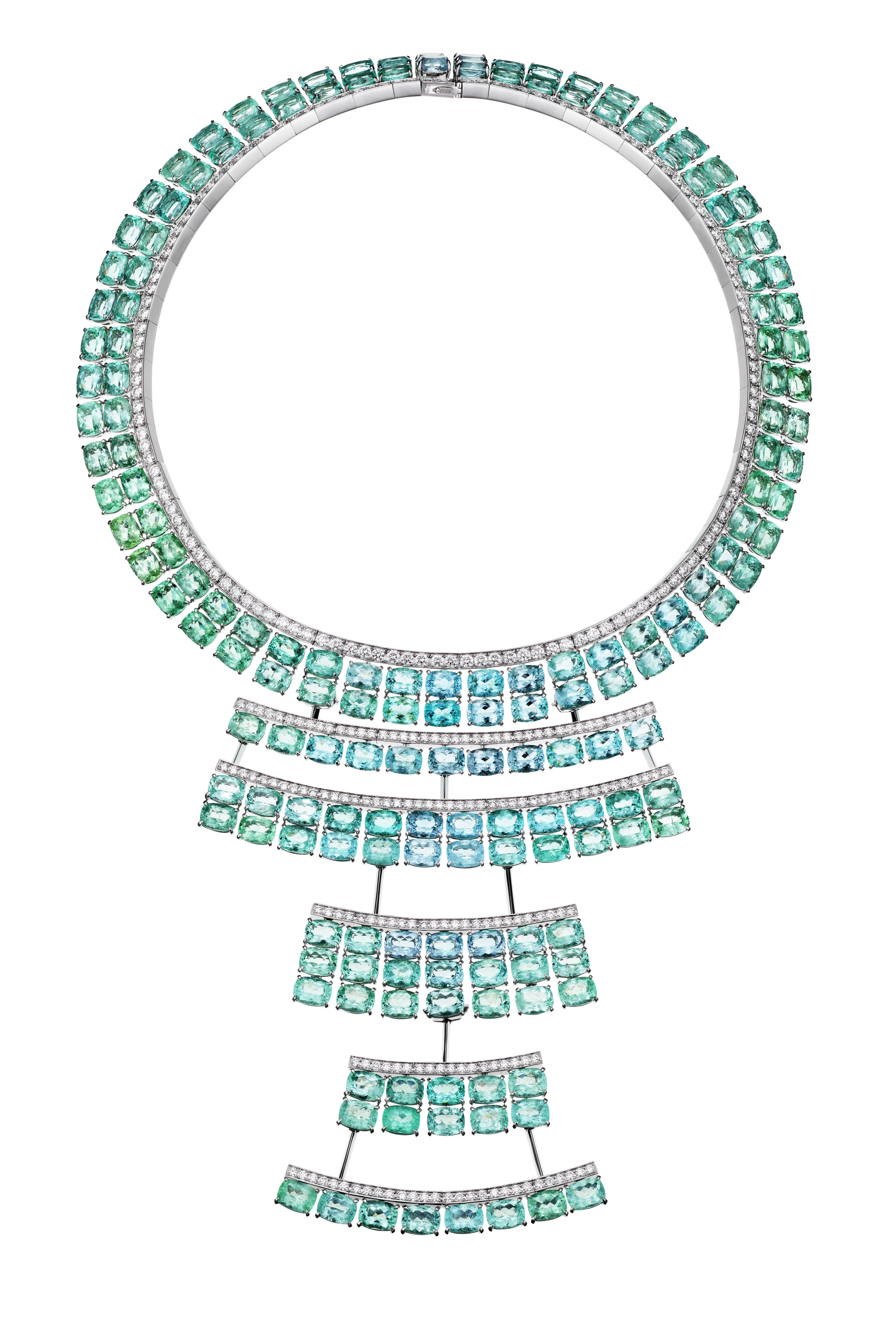 For the company’s 10th anniversary, Gaspard designed a necklace, bracelet and earrings set called Guarani, using Paraiba tourmalines from Mozambique in dégradé aqua blue. With its bold, architectural lines, the necklace is reticulated to move with the wearer, making it strikingly modern and a technical masterpiece. Clearly delighted with the end result, Gaspard has been inspired to bring more colour to market in her 2021 ranges.