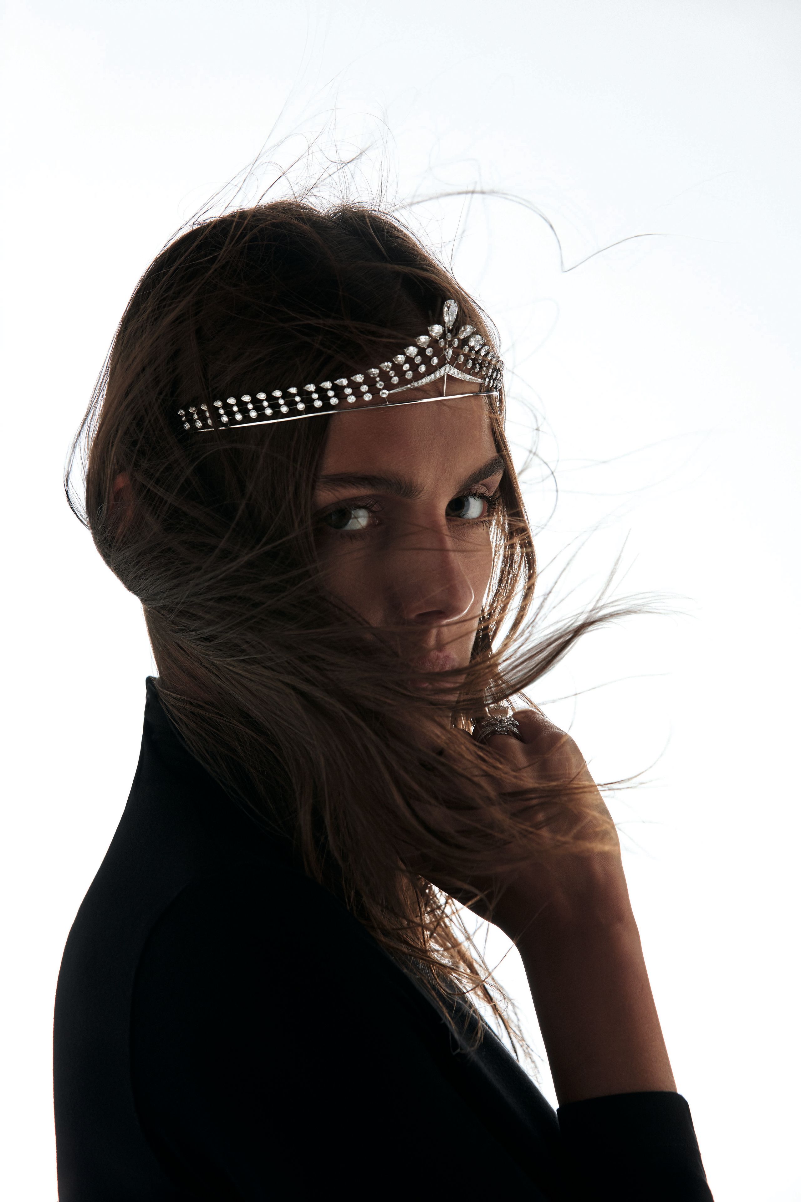 Joséphine Valse Impériale Tiara in white gold, set with pear-shaped and brilliant-cut diamonds; Joséphine Aigrette Impériale ring in platinum, set with brilliant-cut diamonds and a pear-shaped diamond, both price on request, Chaumet